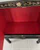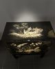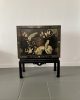 Gabinete oriental / mueble bar Mueble bar lacado de estilo japonés, a menudo caracterizado por su acabado negro y sus ornamentadas decoraciones en pan de oro o «Chinoiserie» pintadas a mano.En negro con decoración polichromada y interior rojo – de mitad del Siglo XX