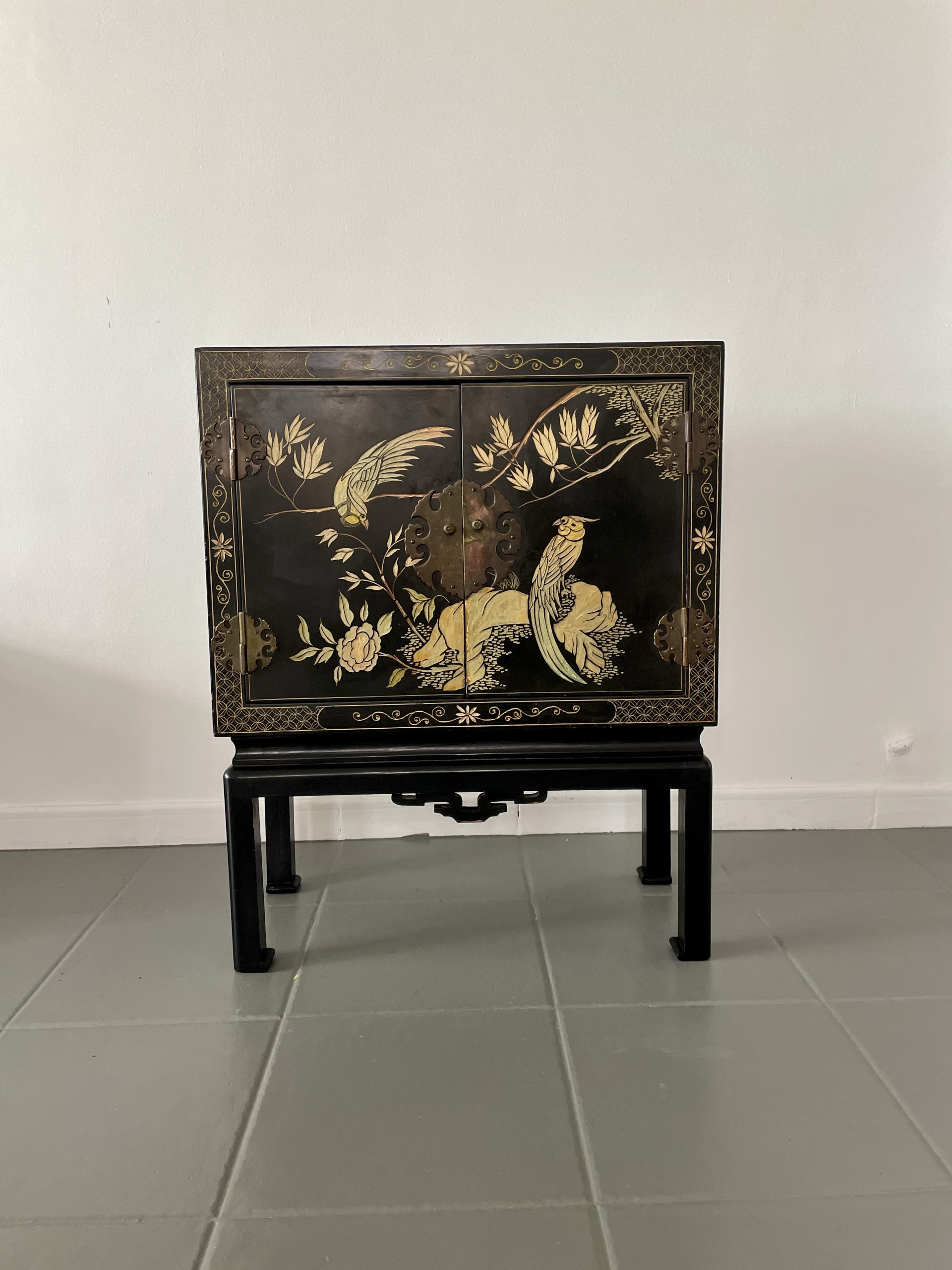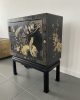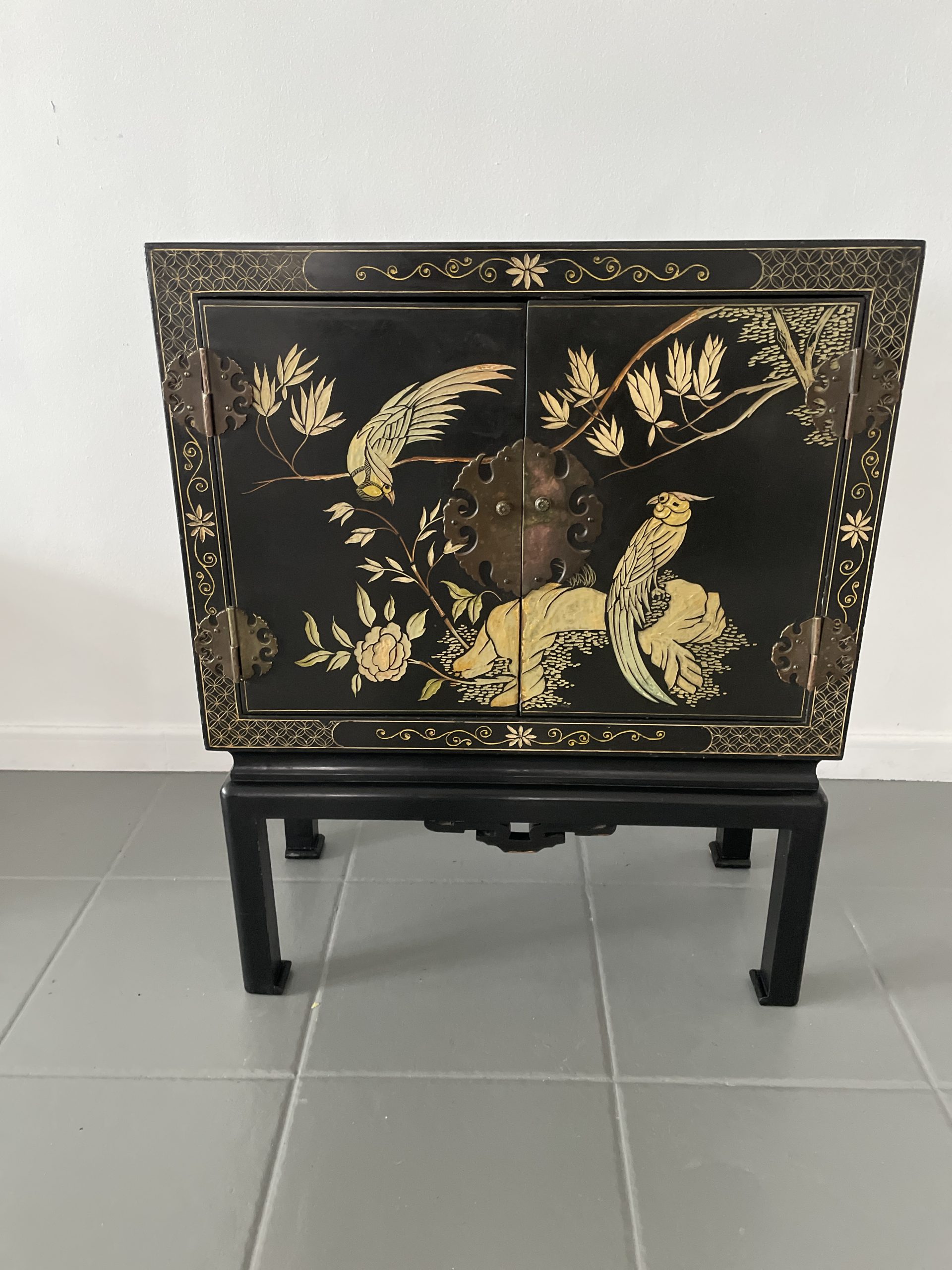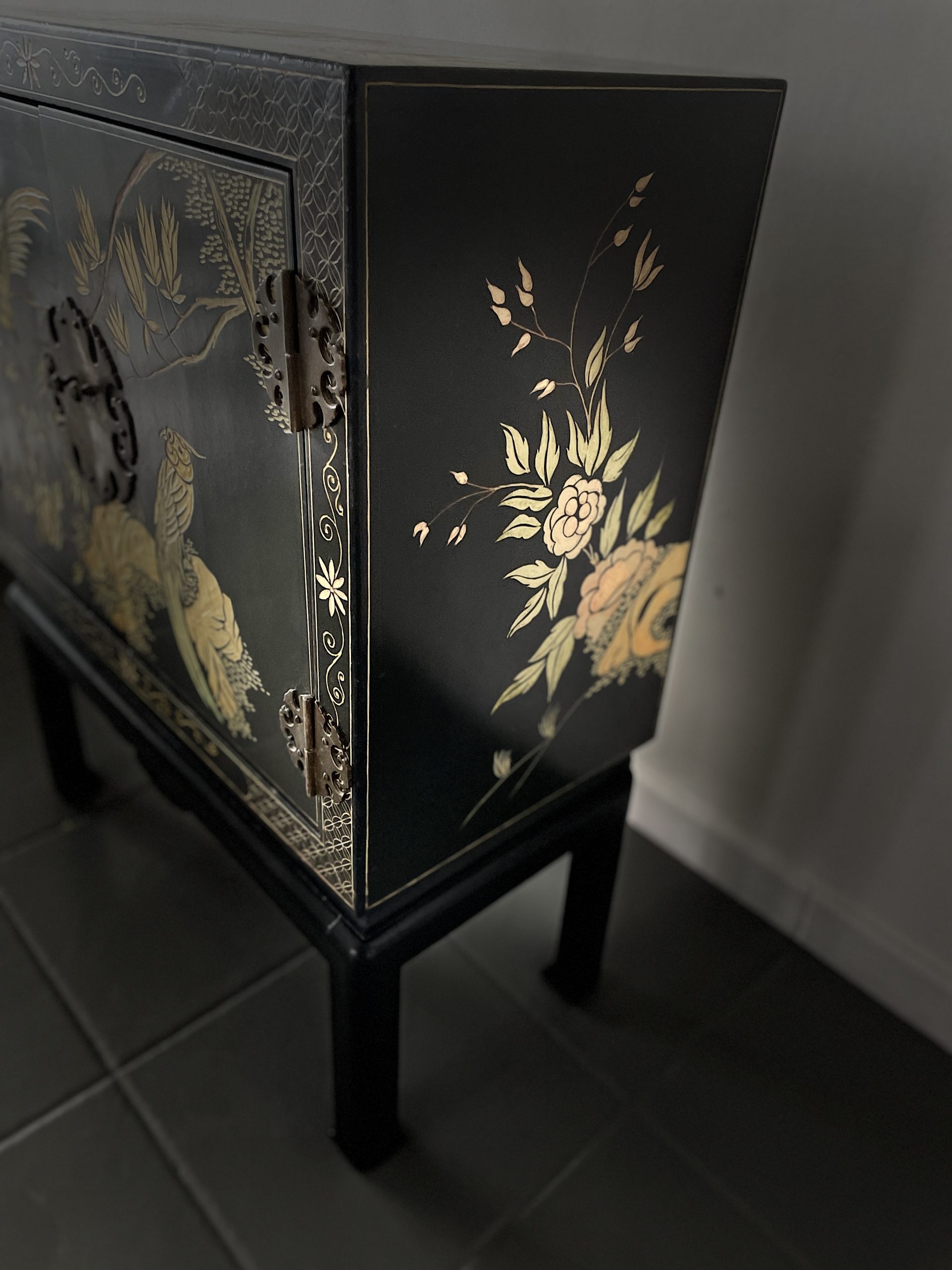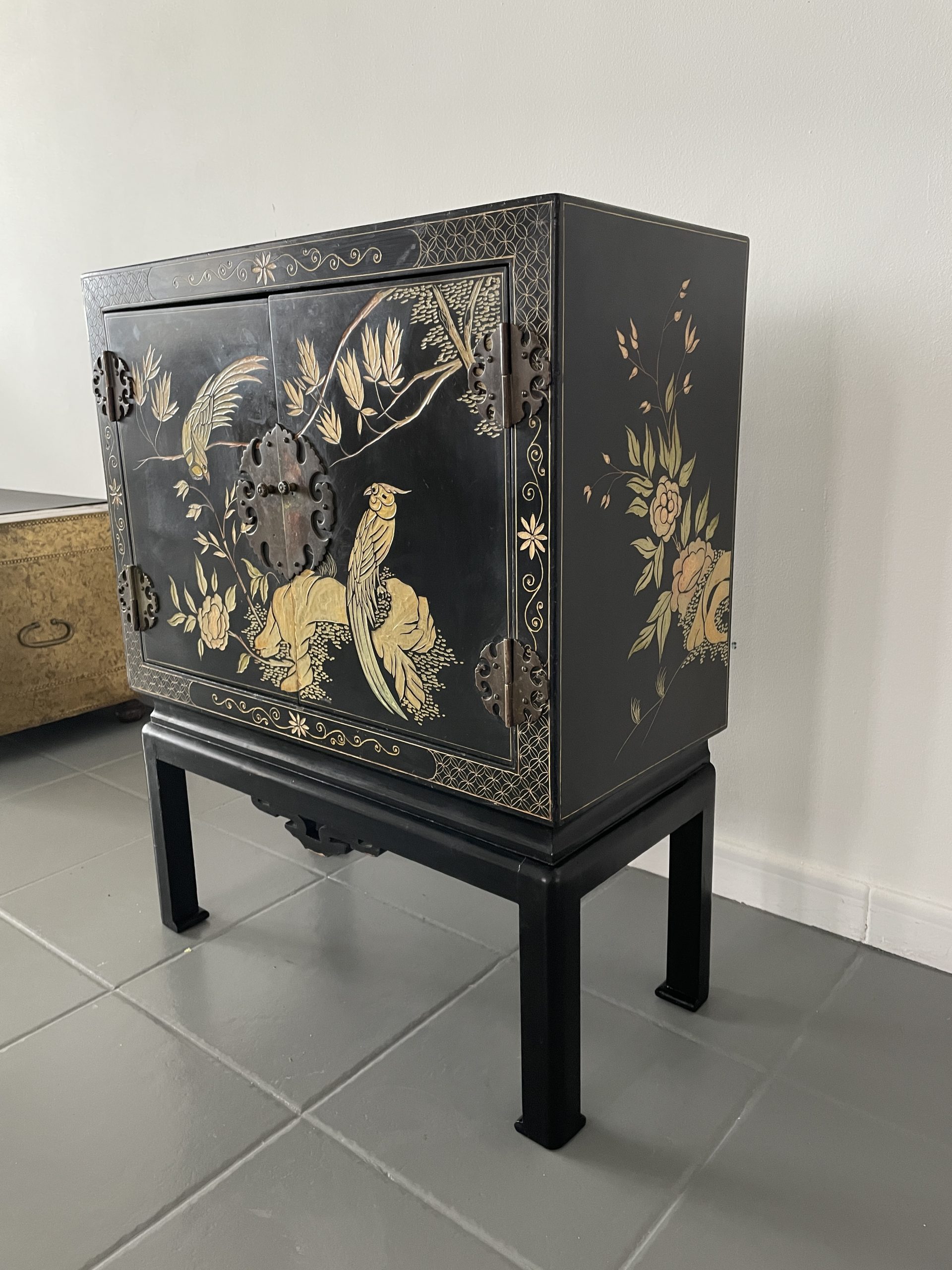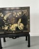 Elegante gabinete oriental de madera lacada en negro, ricamente decorado con motivos florales y aves exóticas en acabado dorado, realizados en relieve y pintura fina. La composición presenta faisanes entre ramas y flores, dentro de un marco decorativo geométrico tradicional.