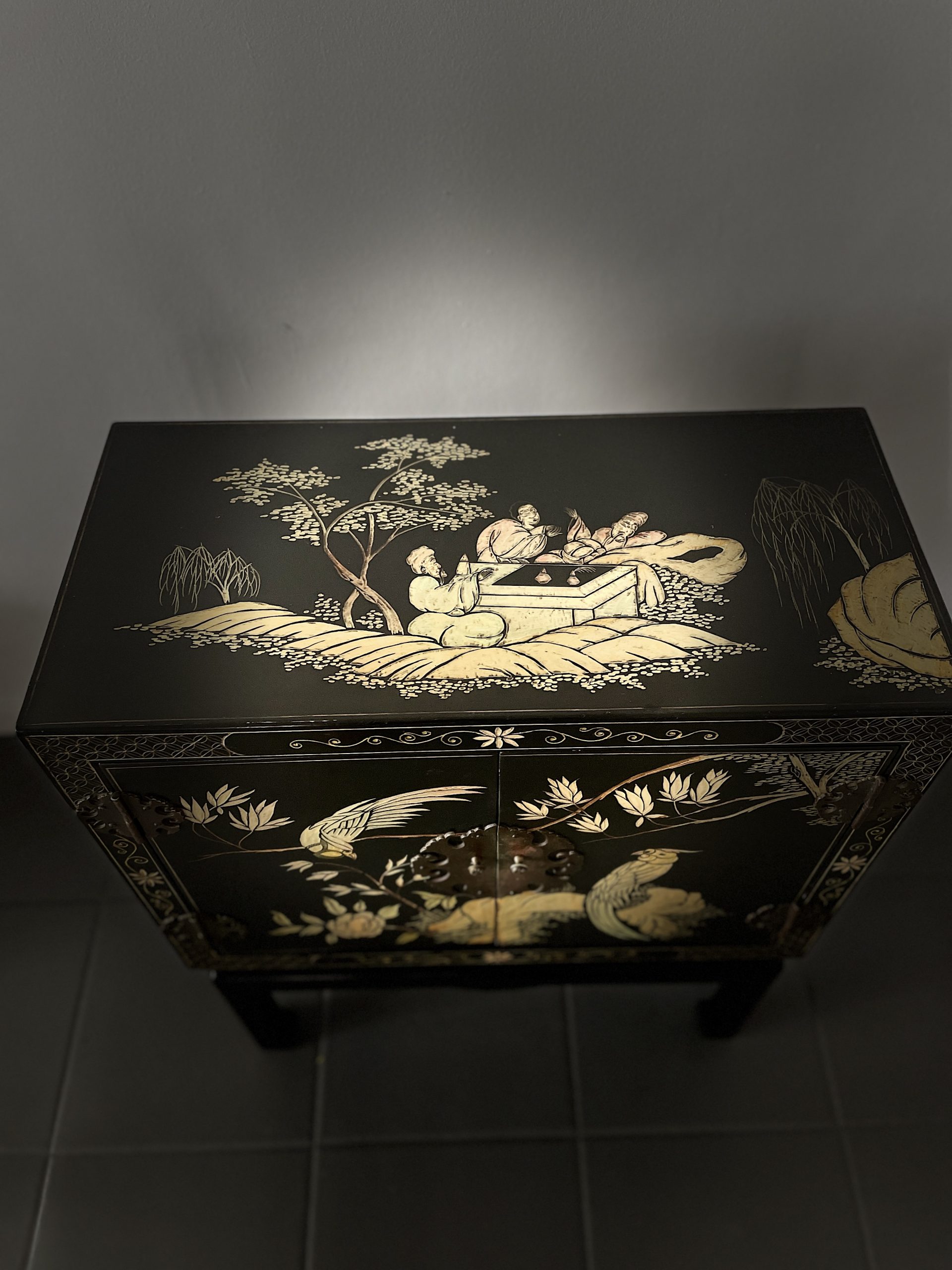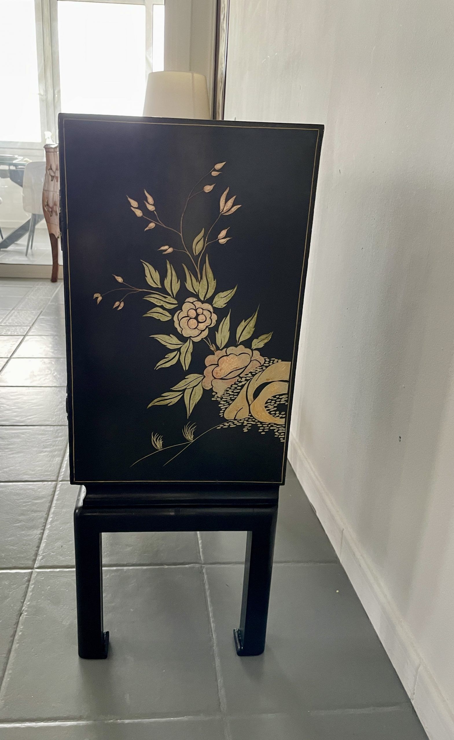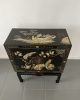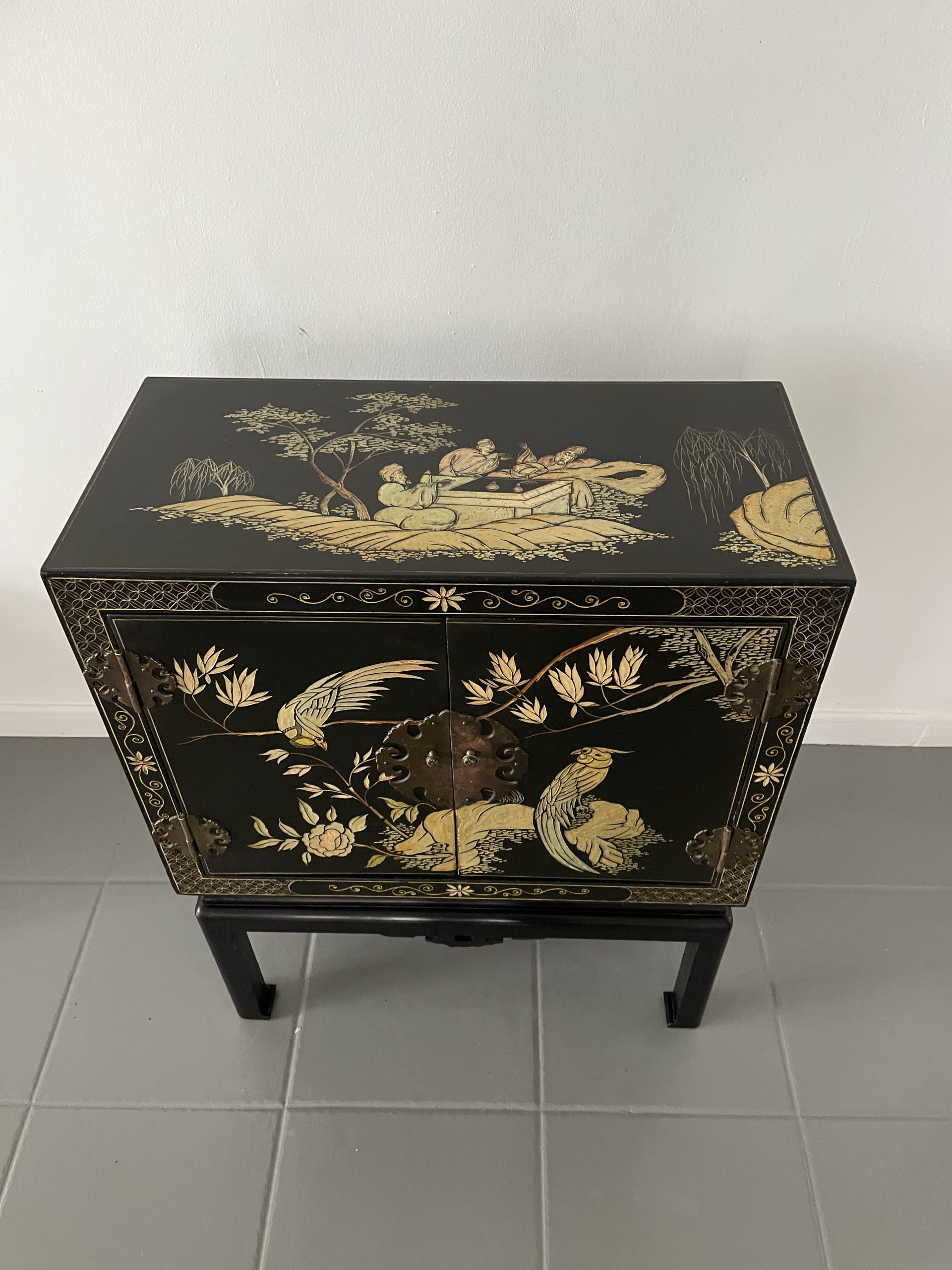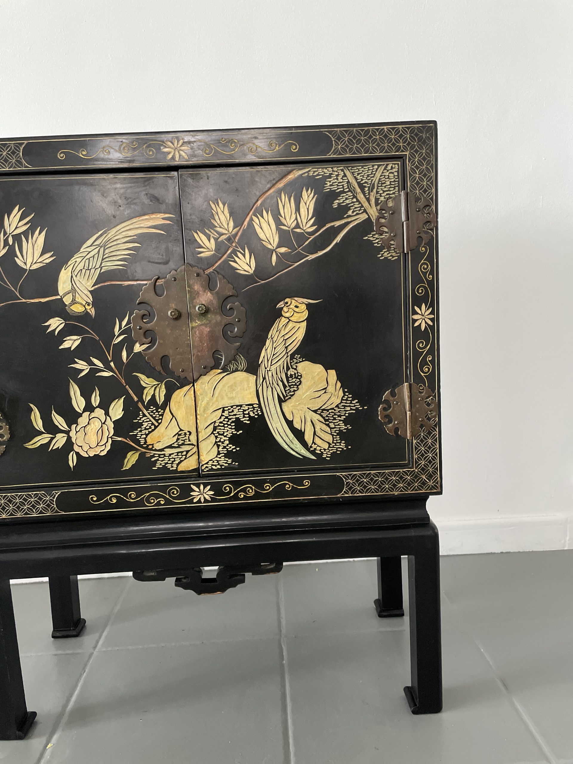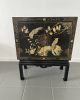 Elegante gabinete oriental de madera lacada en negro, ricamente decorado con motivos florales y aves exóticas en acabado dorado, realizados en relieve y pintura fina. La composición presenta faisanes entre ramas y flores, dentro de un marco decorativo geométrico tradicional.