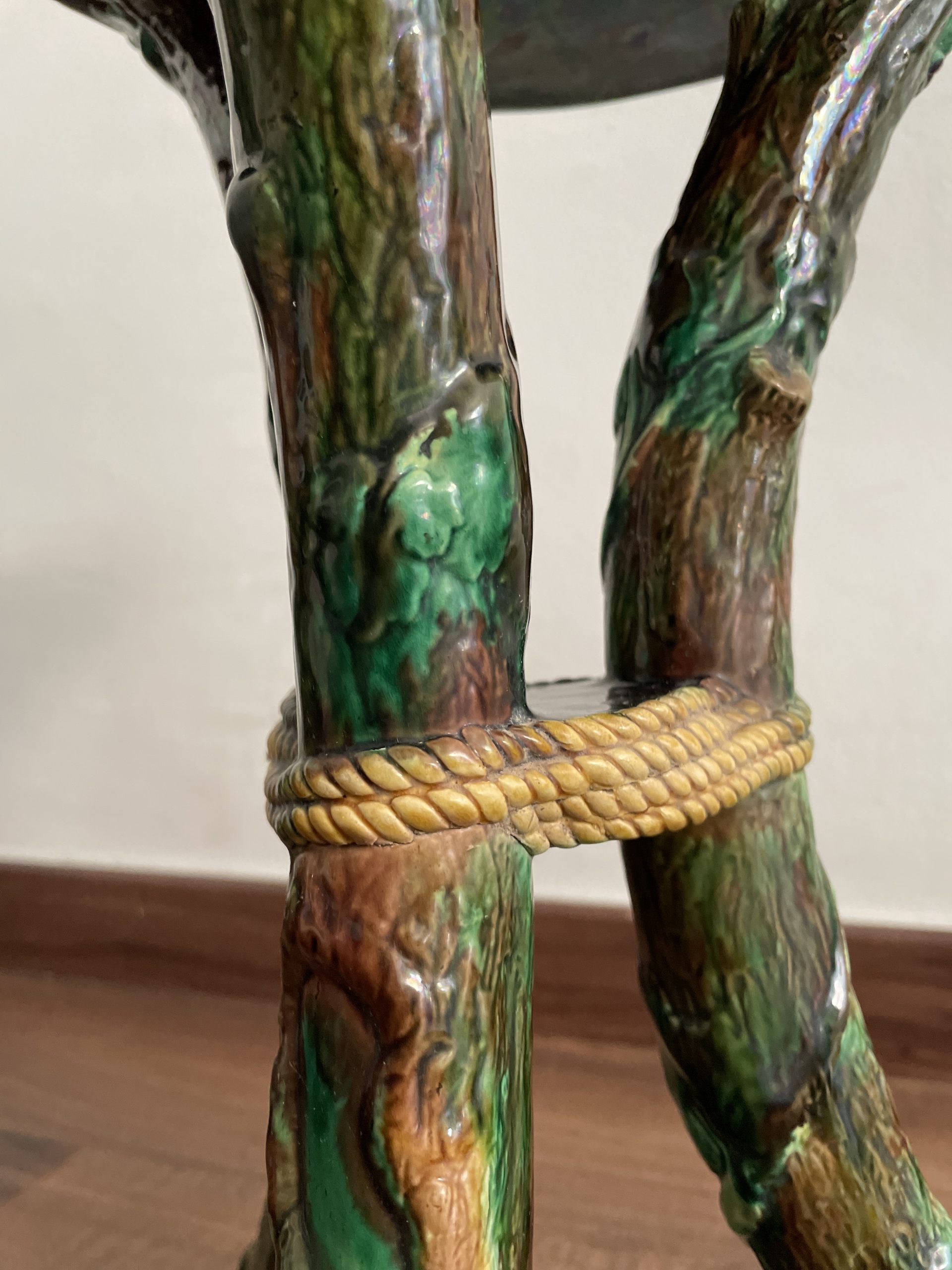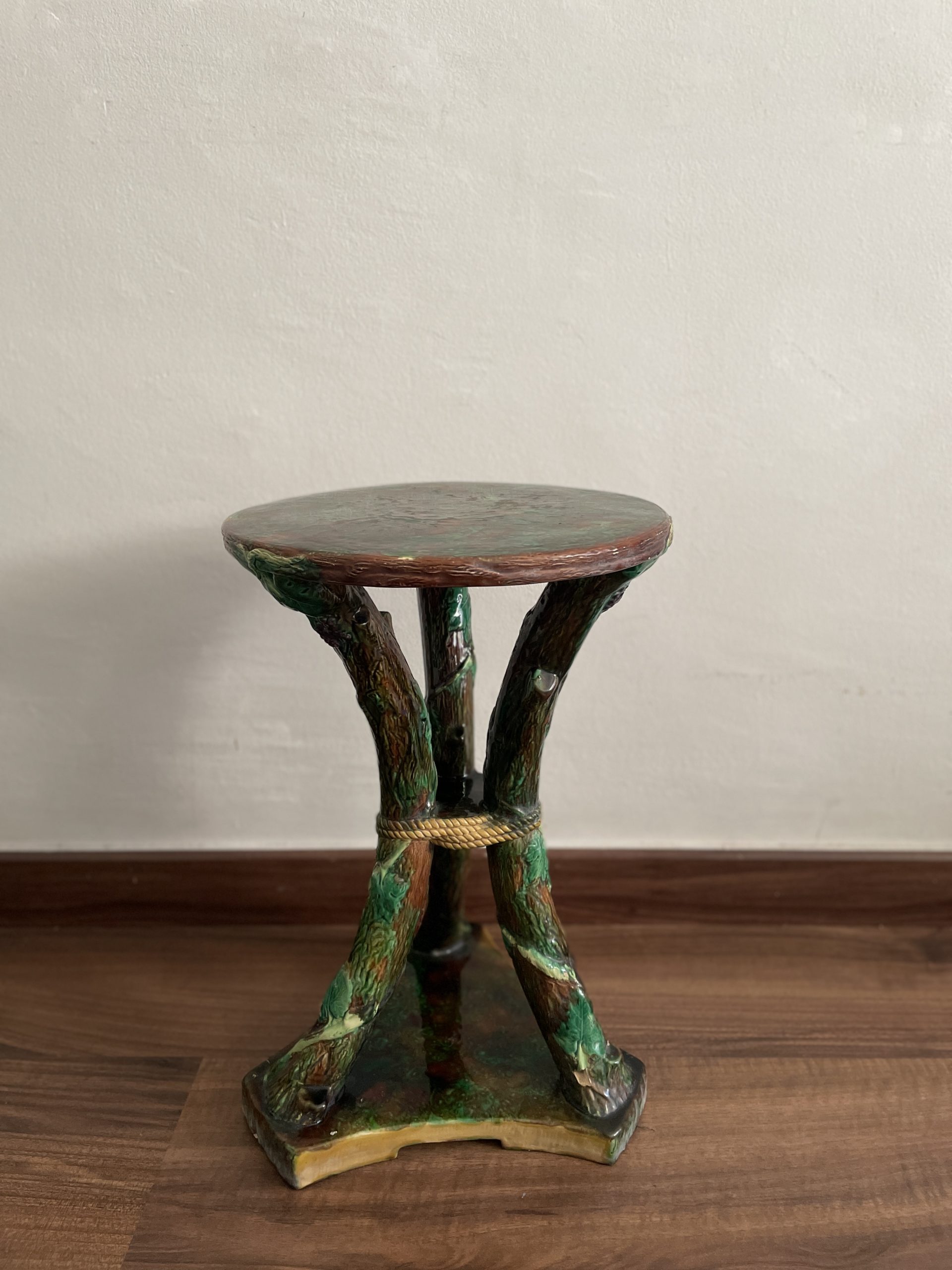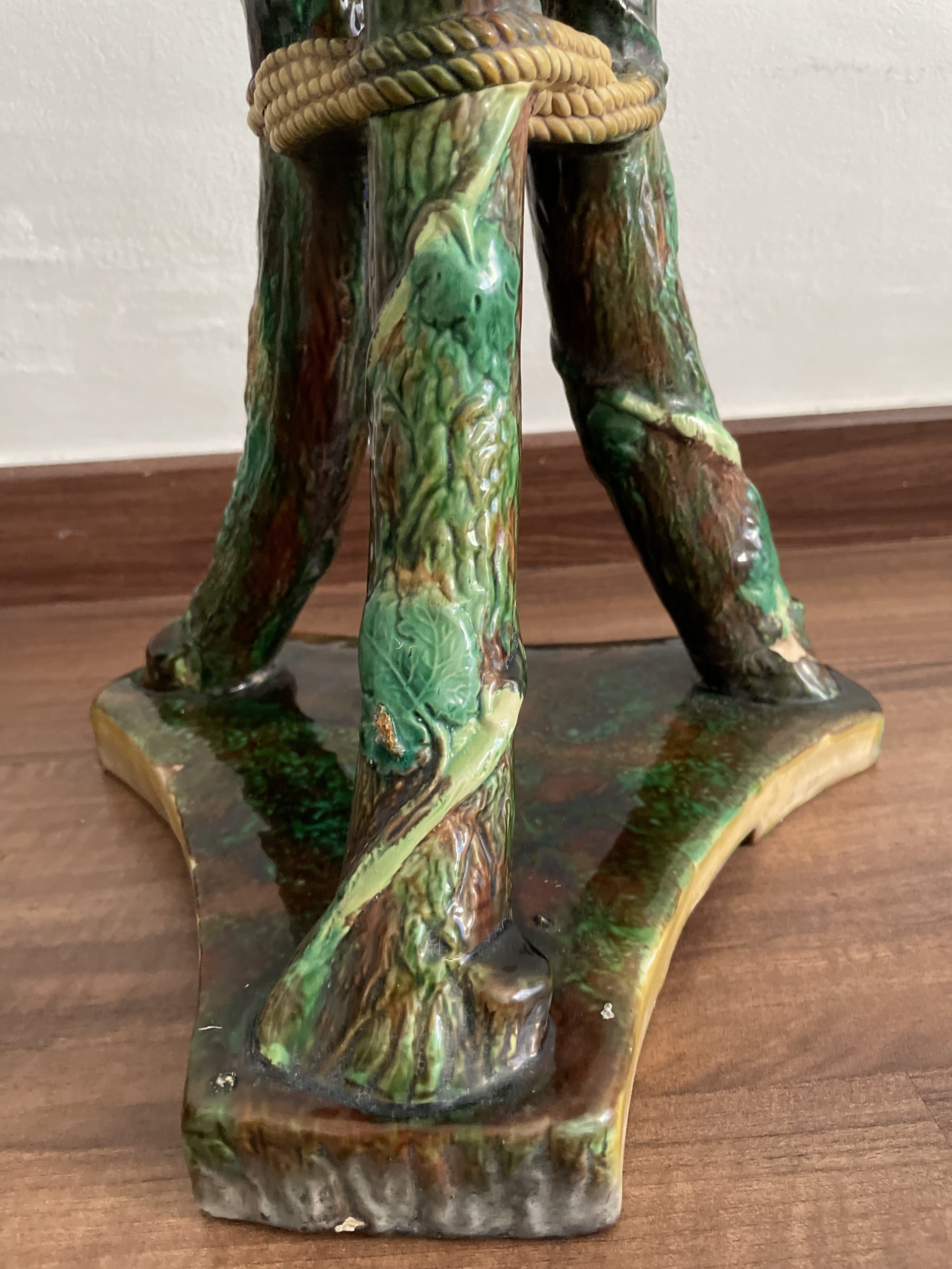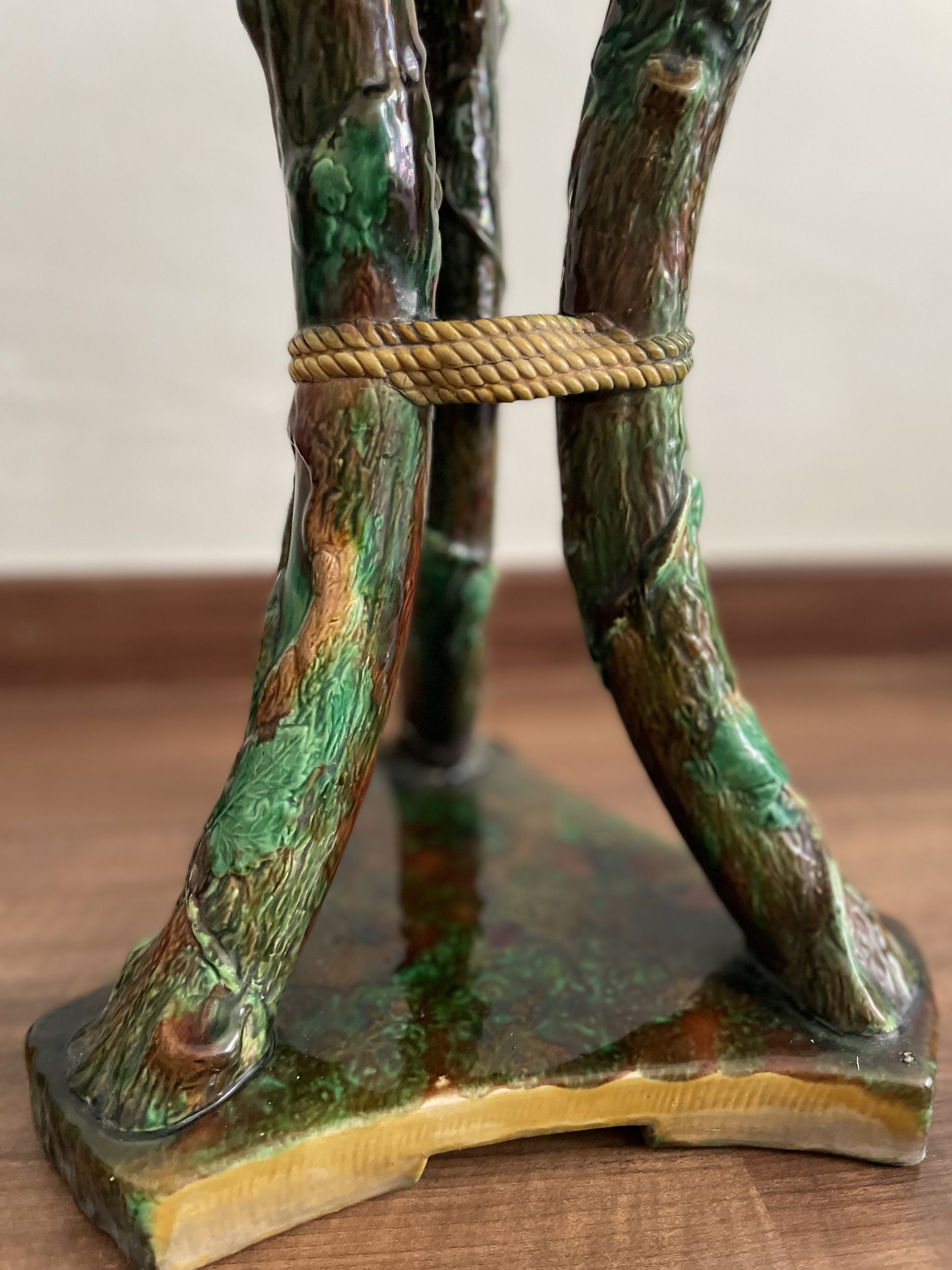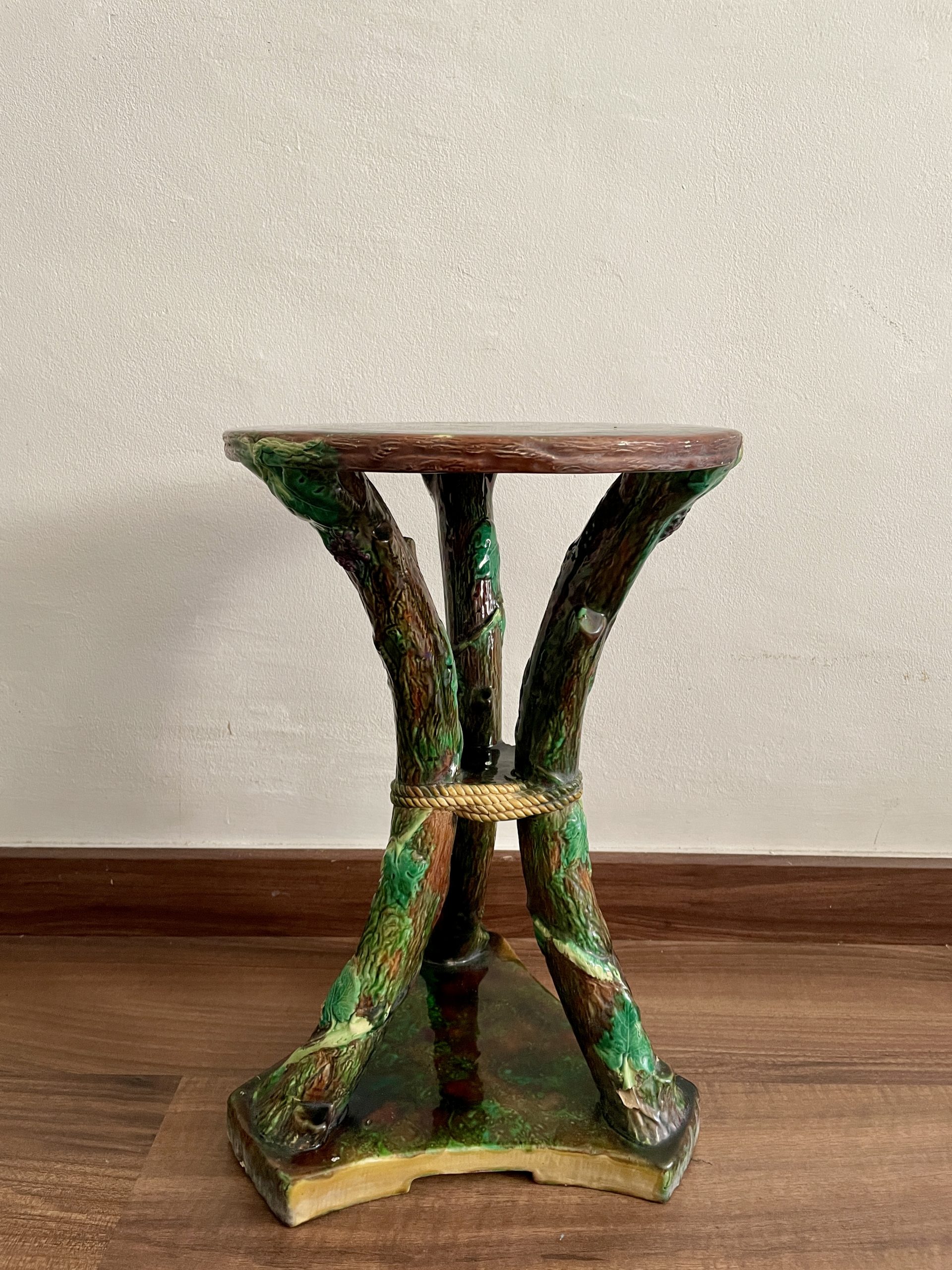 Asiento de jardín de mayólica de George Jones, Inglaterra, c. 1875, modelado como una sección delgada de un tronco de árbol sostenido por tres ramas curvas entrelazadas con enredaderas foliadas y atadas en el centro con una cuerda, sobre una base triangular achaflanada,