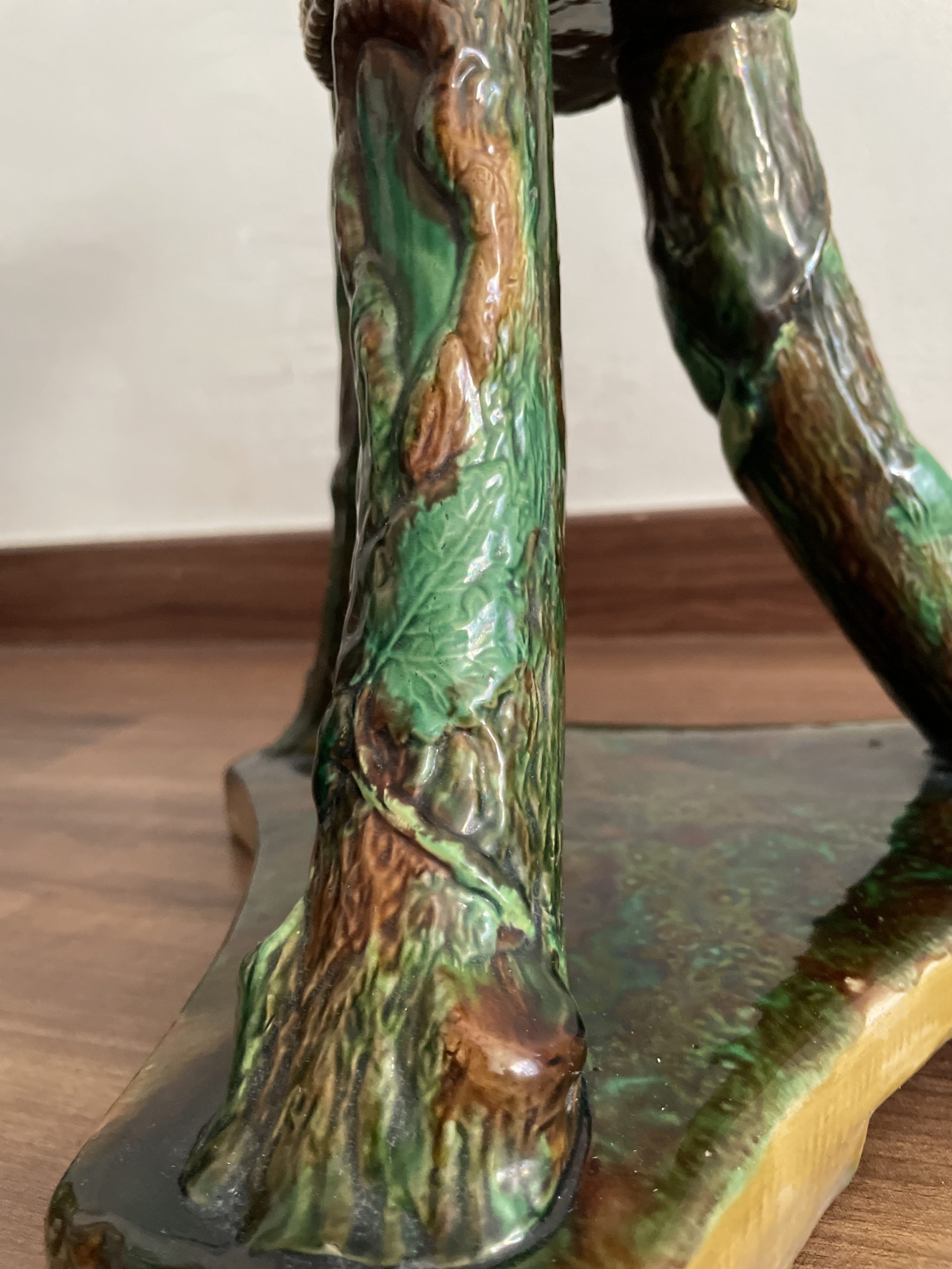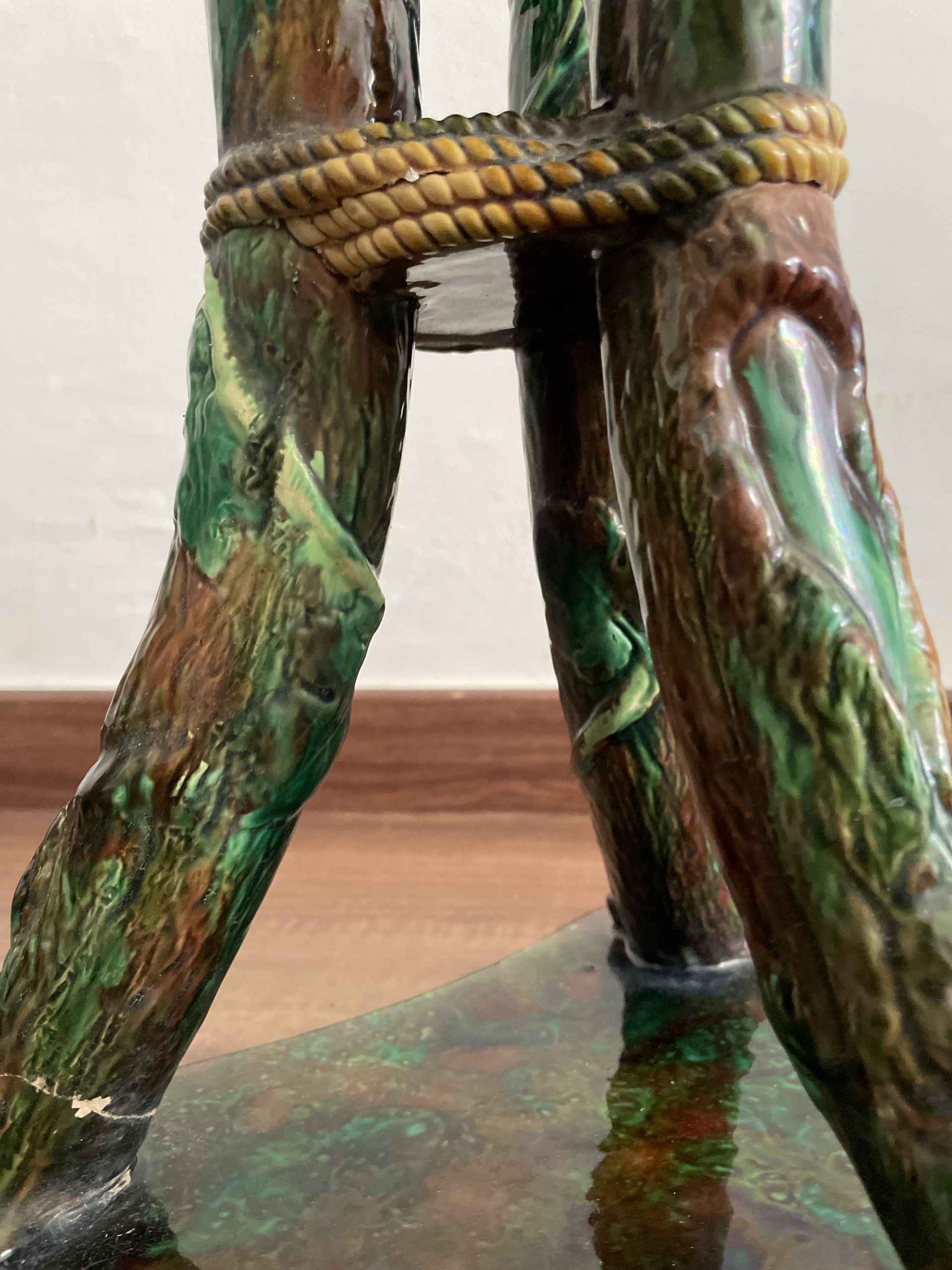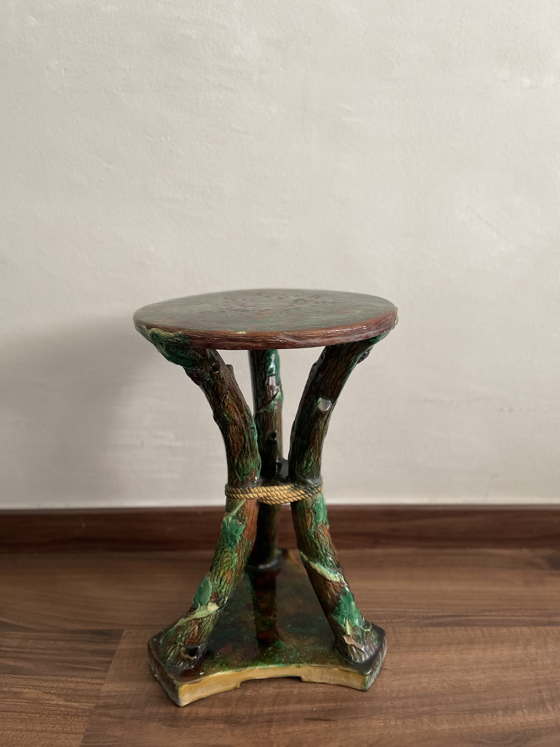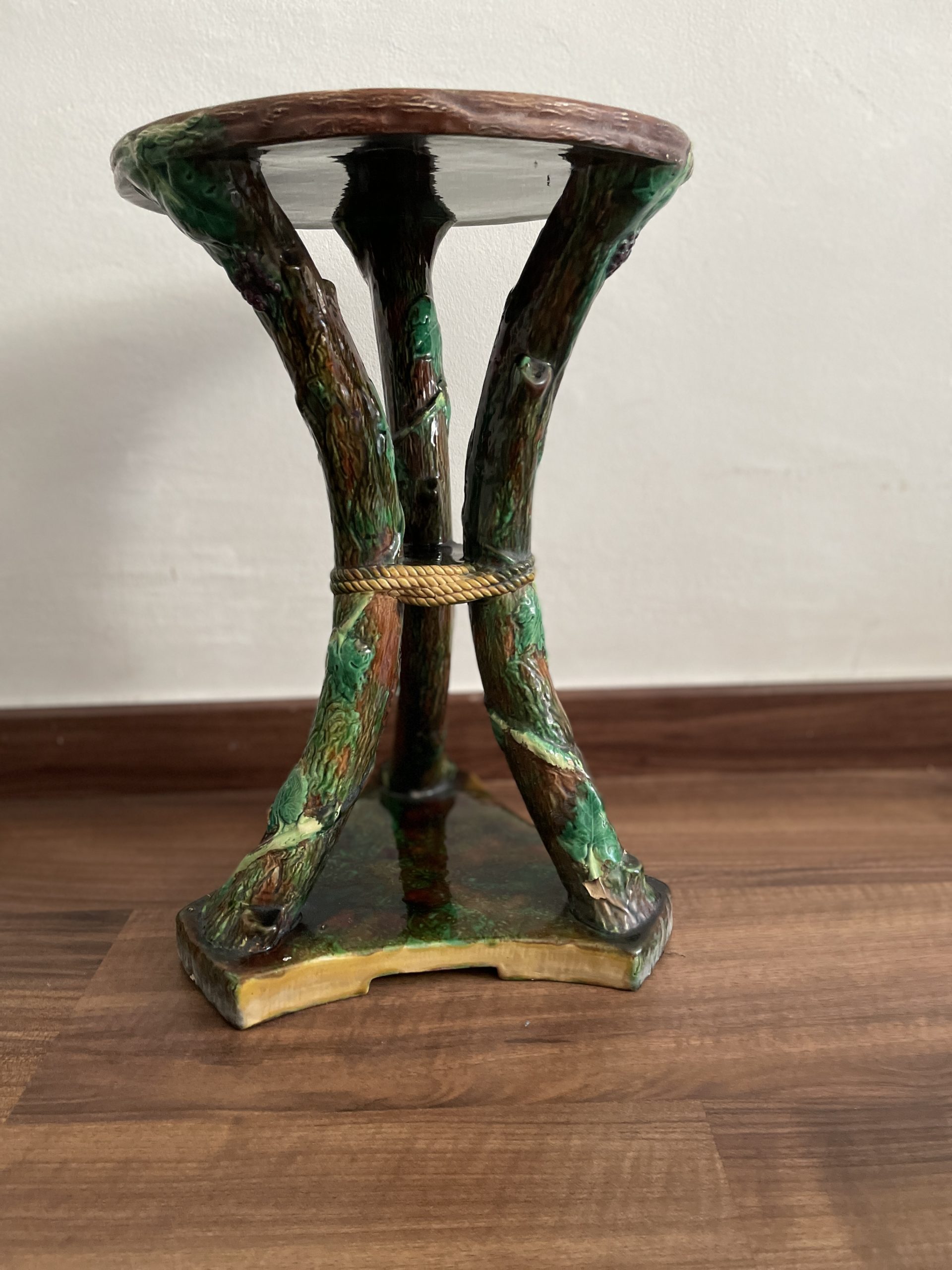 Asiento de jardín de mayólica de George Jones, Inglaterra, c. 1875, modelado como una sección delgada de un tronco de árbol sostenido por tres ramas curvas entrelazadas con enredaderas foliadas y atadas en el centro con una cuerda, sobre una base triangular achaflanada,