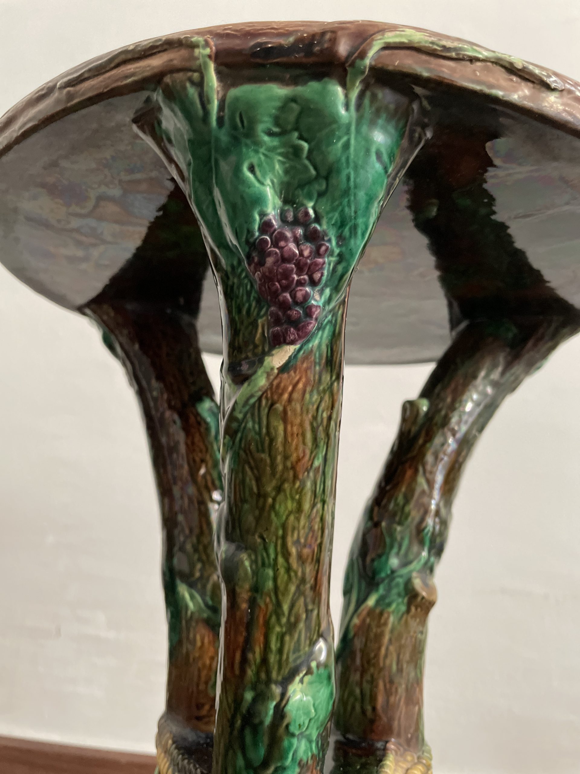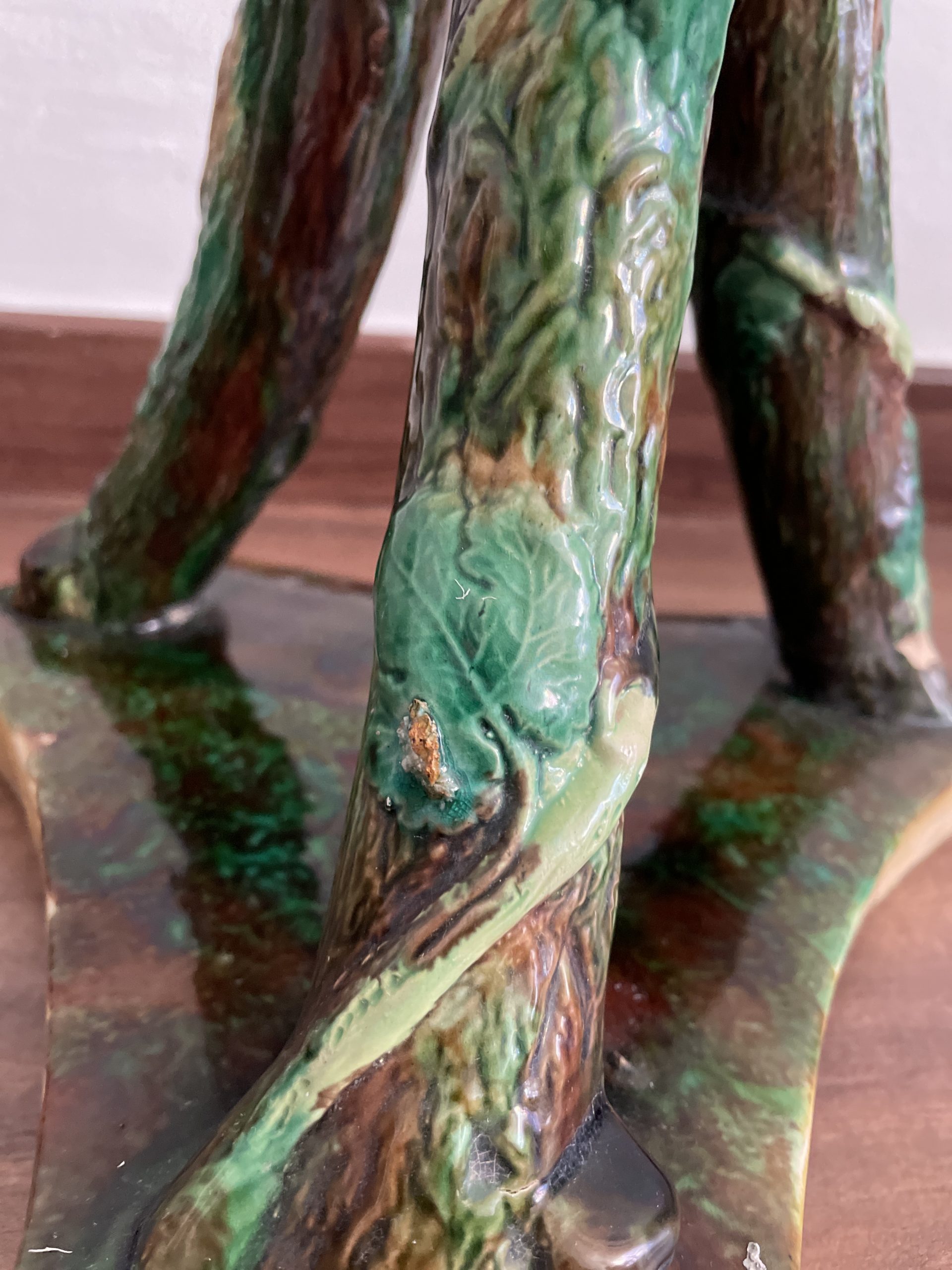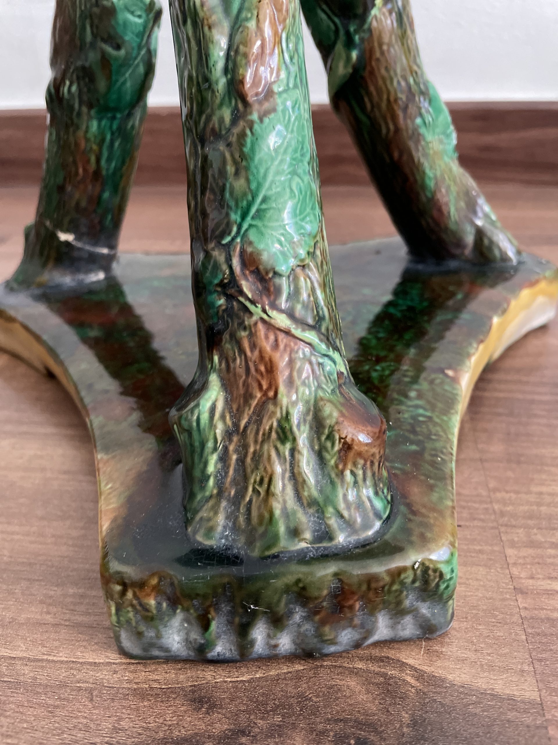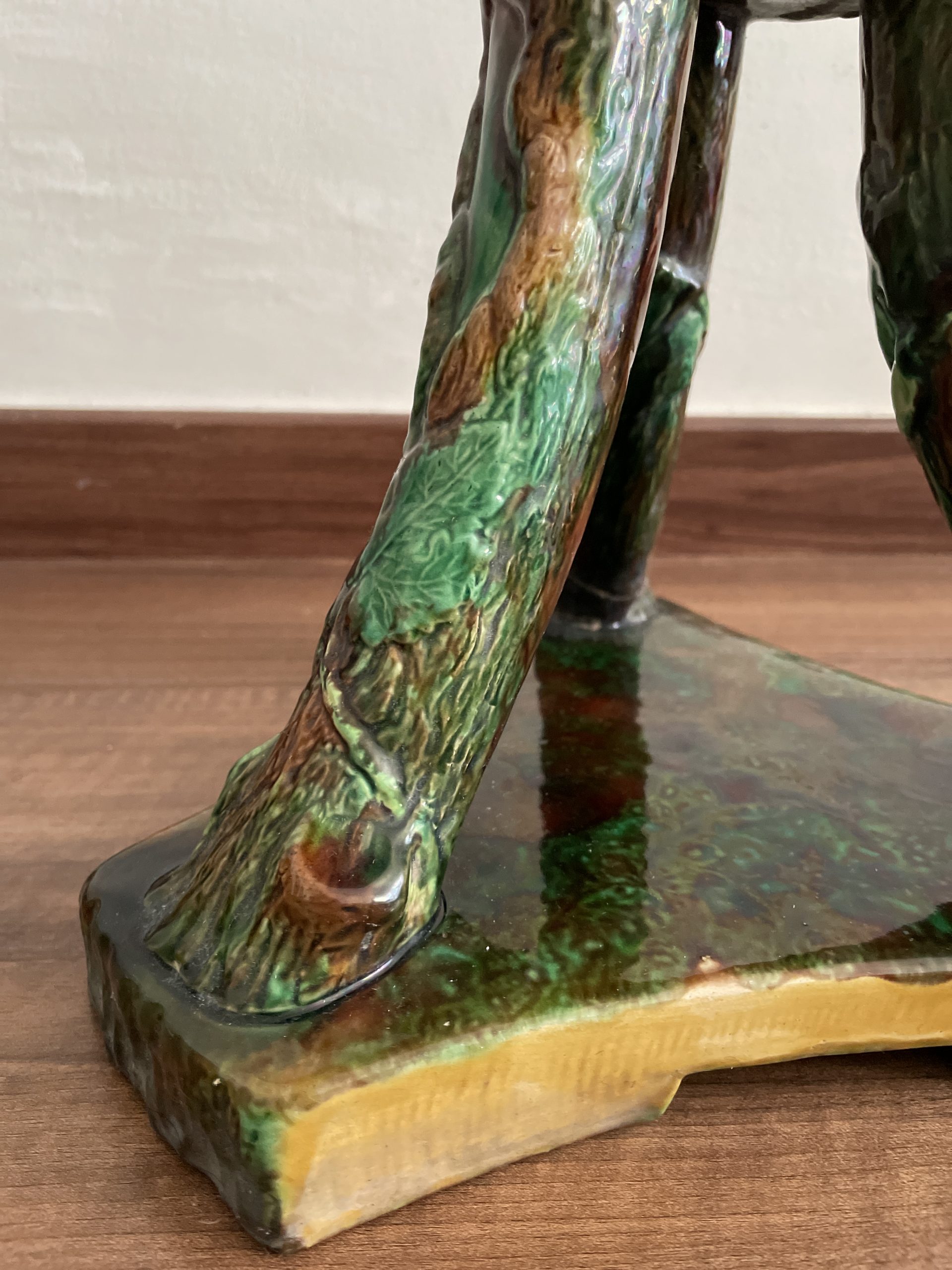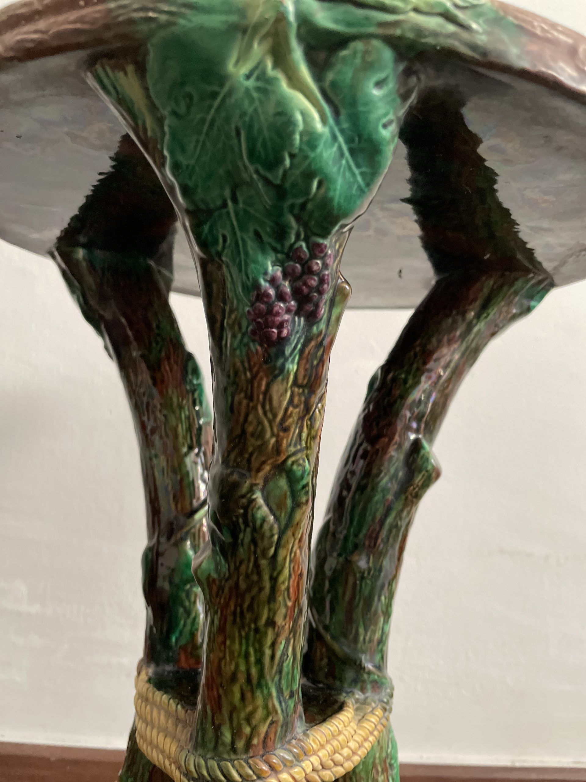 Asiento de jardín de mayólica de George Jones, Inglaterra, c. 1875, modelado como una sección delgada de un tronco de árbol sostenido por tres ramas curvas entrelazadas con enredaderas foliadas y atadas en el centro con una cuerda, sobre una base triangular achaflanada,