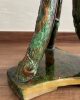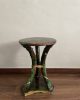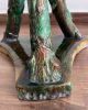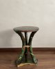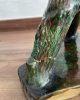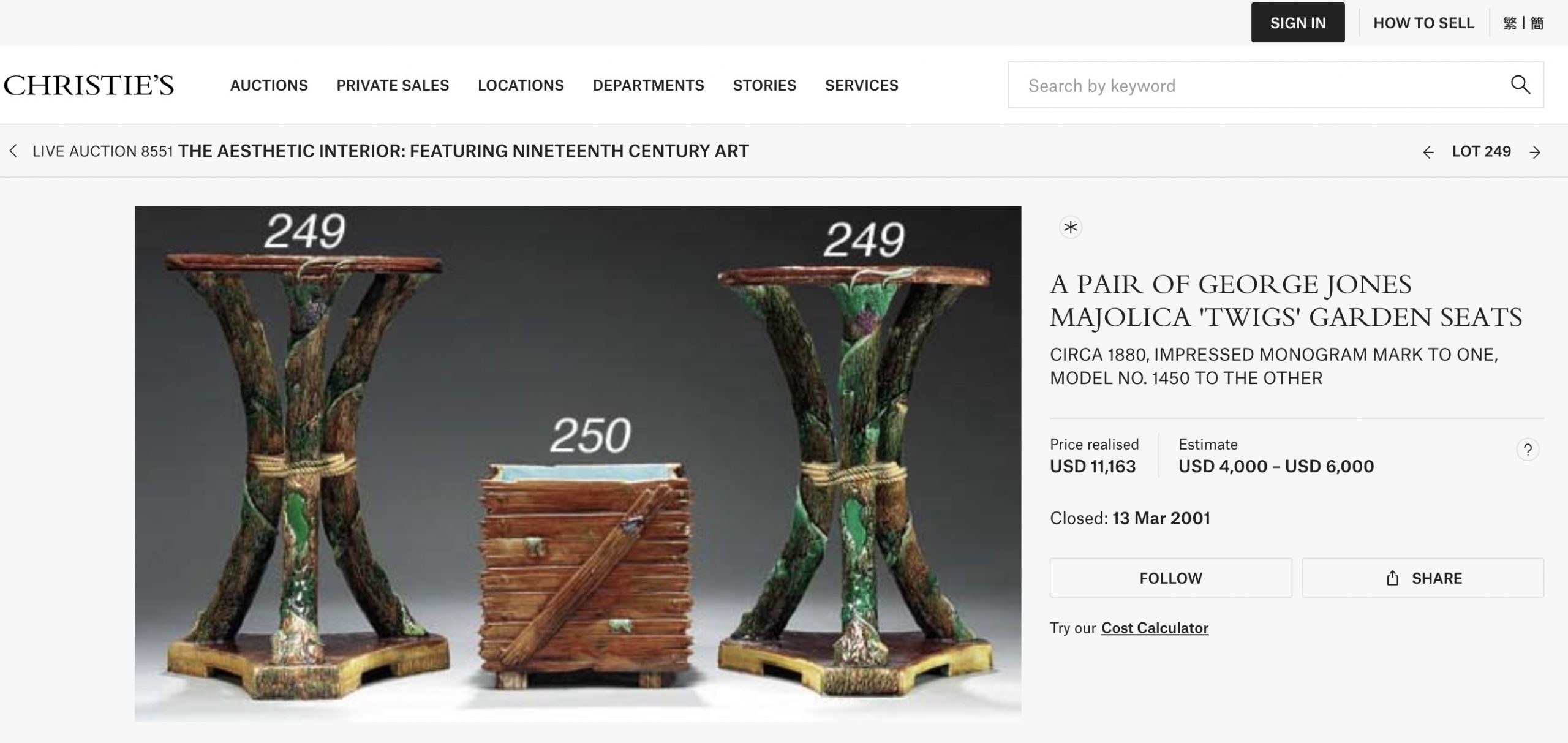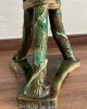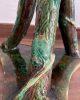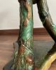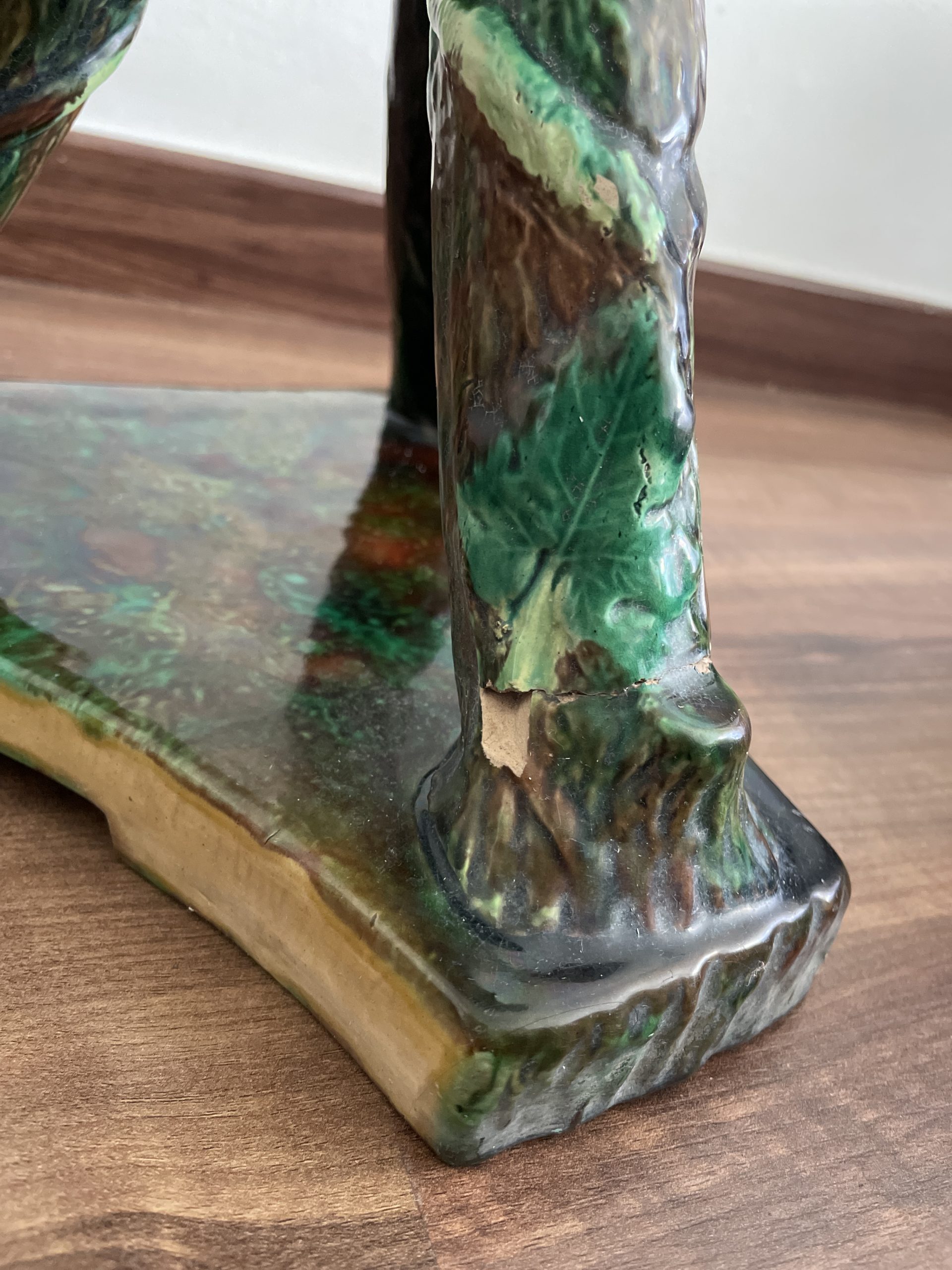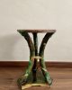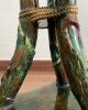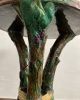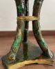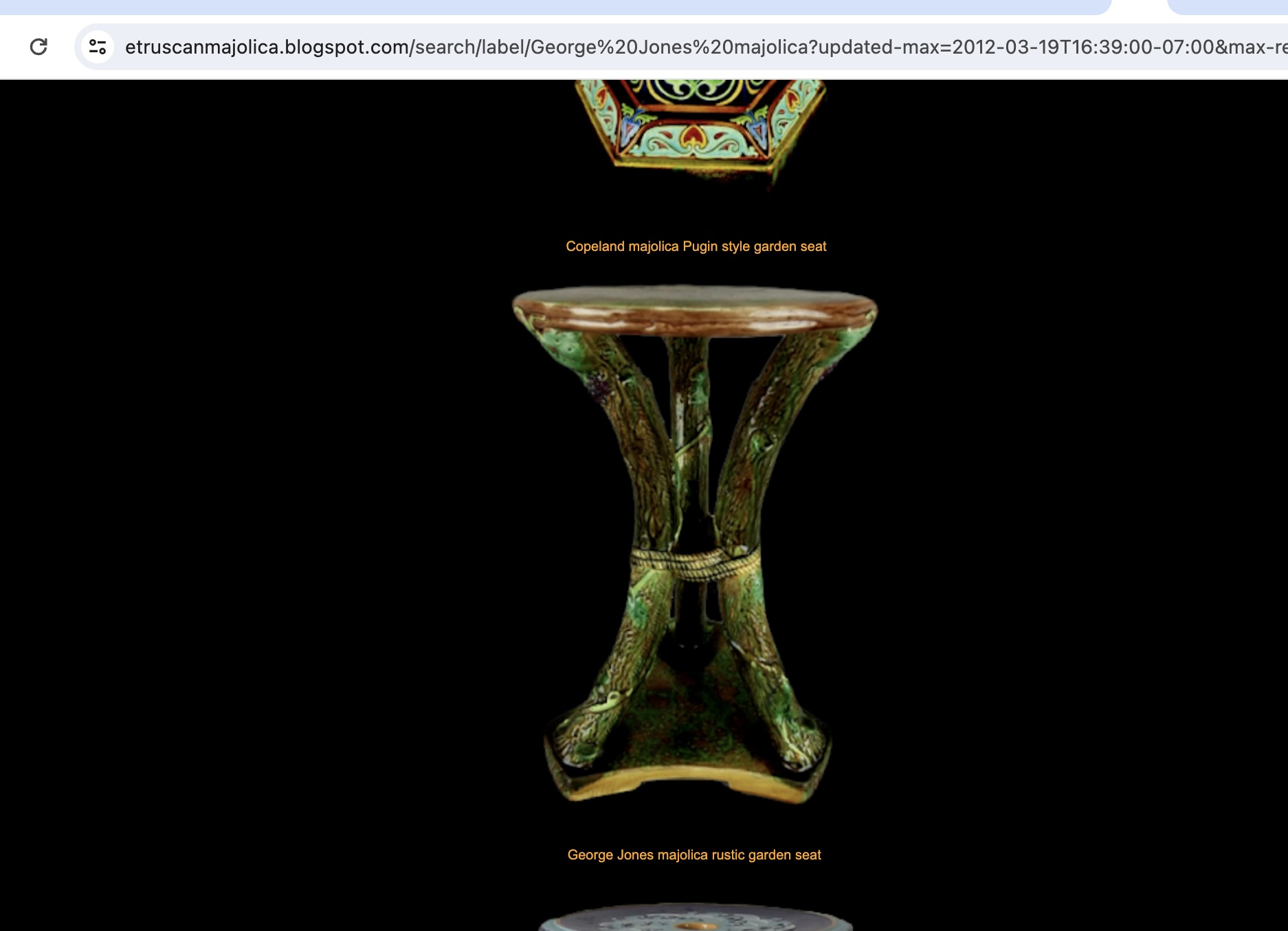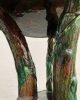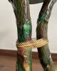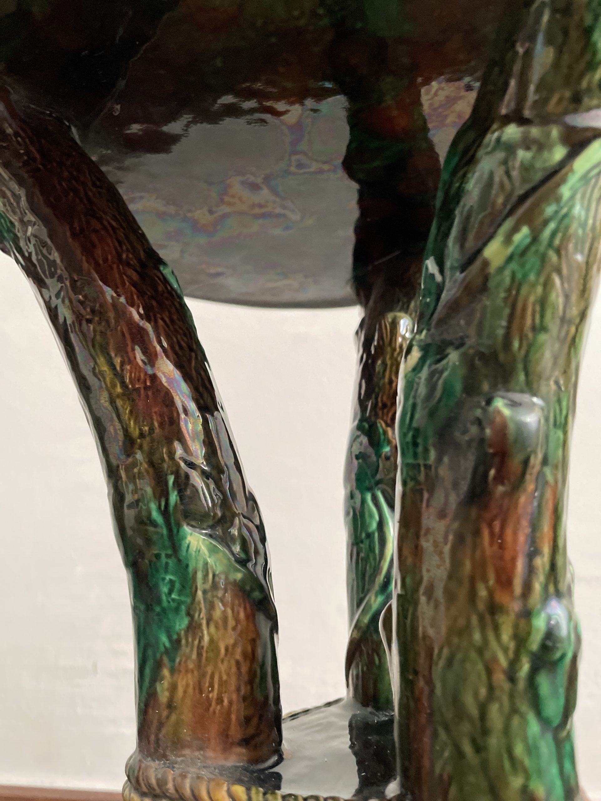 Asiento de jardín de mayólica de George Jones, Inglaterra, c. 1875, modelado como una sección delgada de un tronco de árbol sostenido por tres ramas curvas entrelazadas con enredaderas foliadas y atadas en el centro con una cuerda, sobre una base triangular achaflanada,