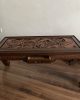 Esta es una pieza muy atractiva, la mesa es estilo mesa de opio, tiene un acabado de laca de dos tonos que acentúa el detalle de la talla.