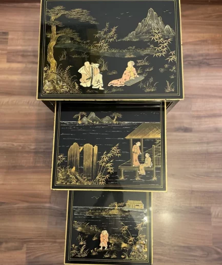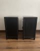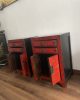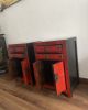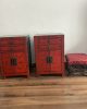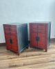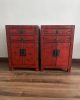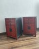 Dos armarios de mitad del siglo XX. Se fabricaron en la región de Shanxy, en China, siguiendo las técnicas de decoración típicas de la antigüedad. Presentan mariposas de pan de oro sobre laca roja con laterales negros. Las bisagras y tiradores son de bronce. Cada armario tiene dos pequeños cajones que rematan las dos puertas. El estado de conservación vintage