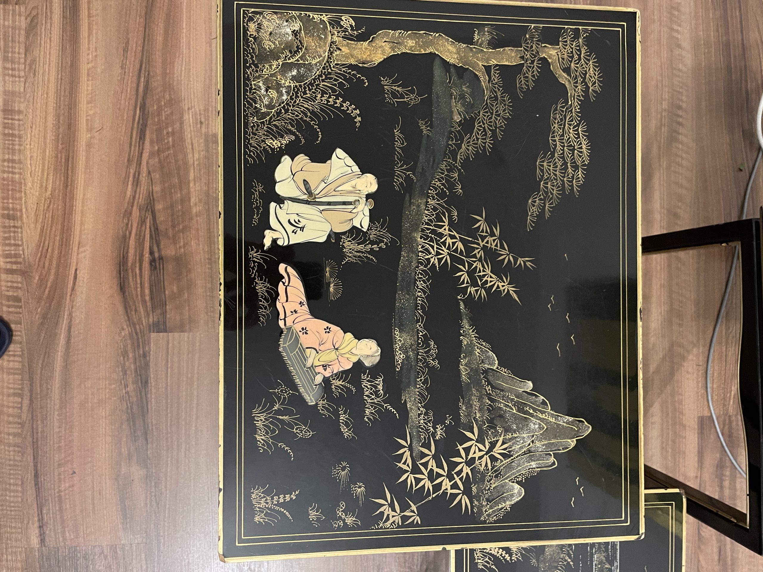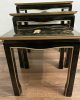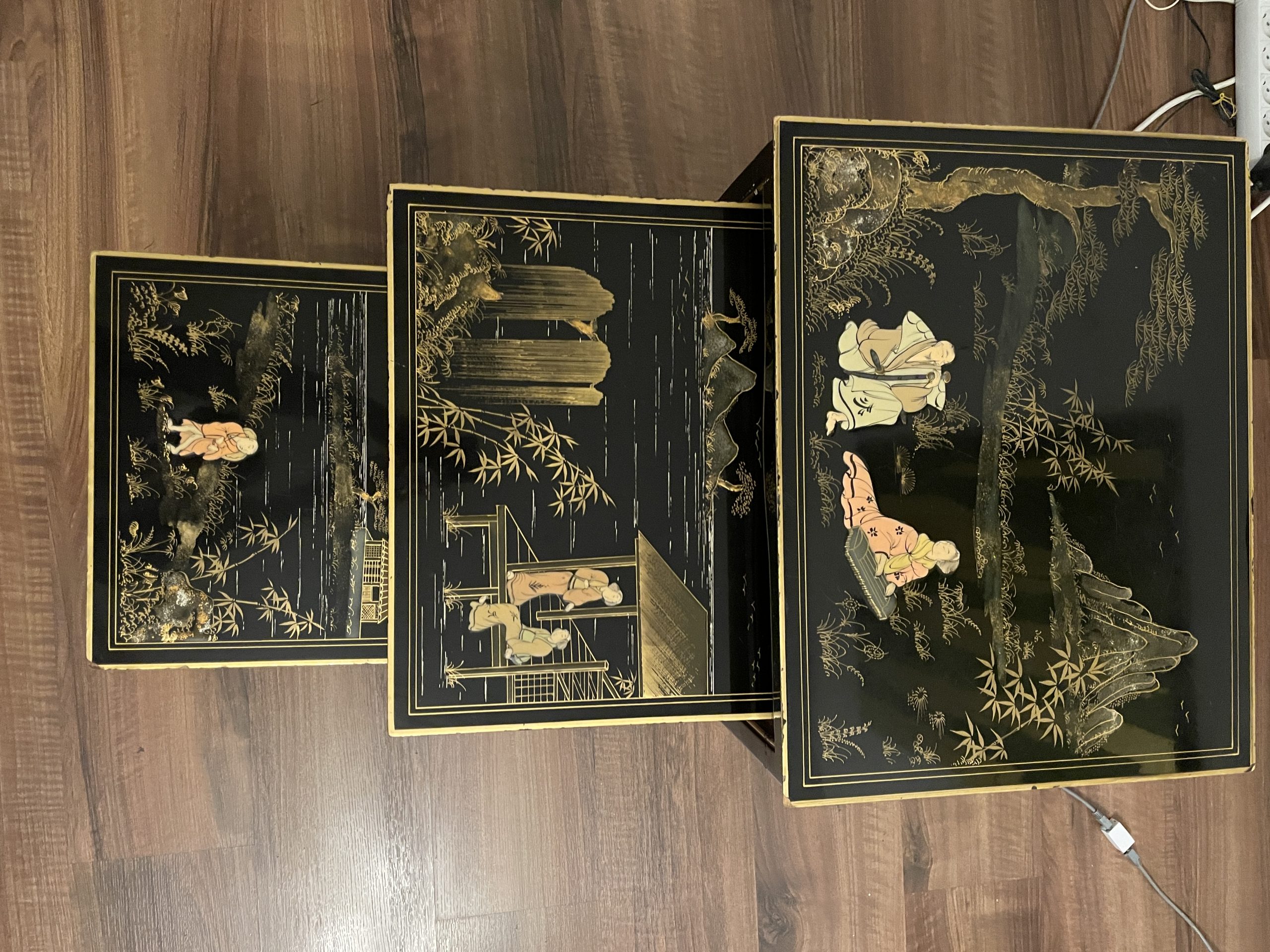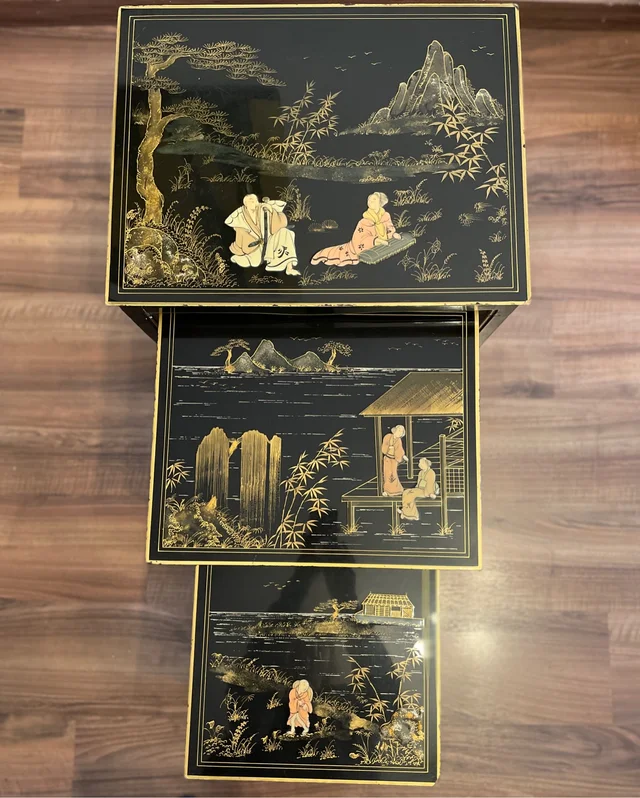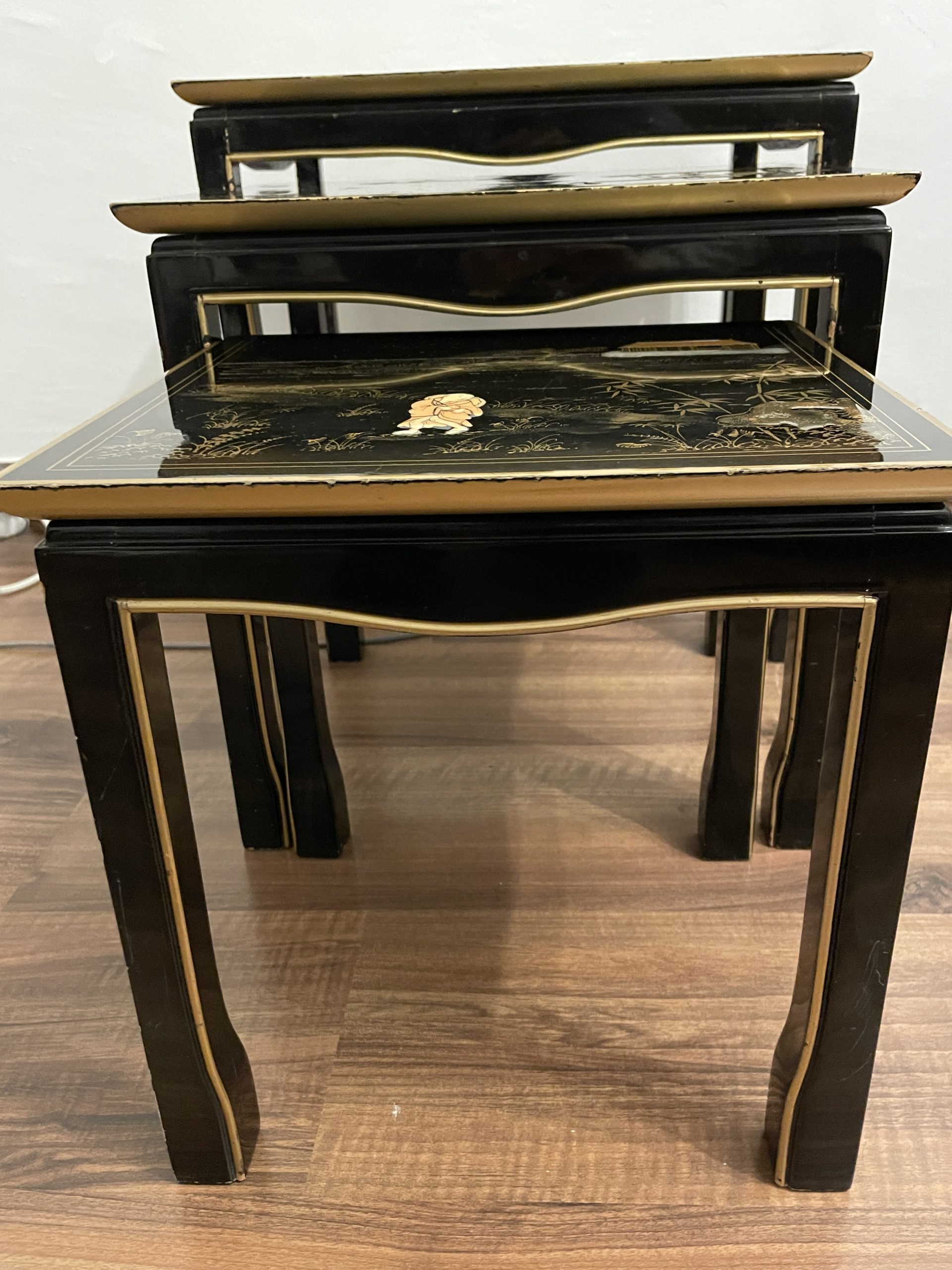 Precioso Conjunto / nido de mesitas estilo oriental. Dibujos volumétricos relieves. Lacado. De los anos 50 s. Desgastos menores según su edad. Tiene tres mesitas