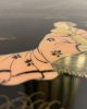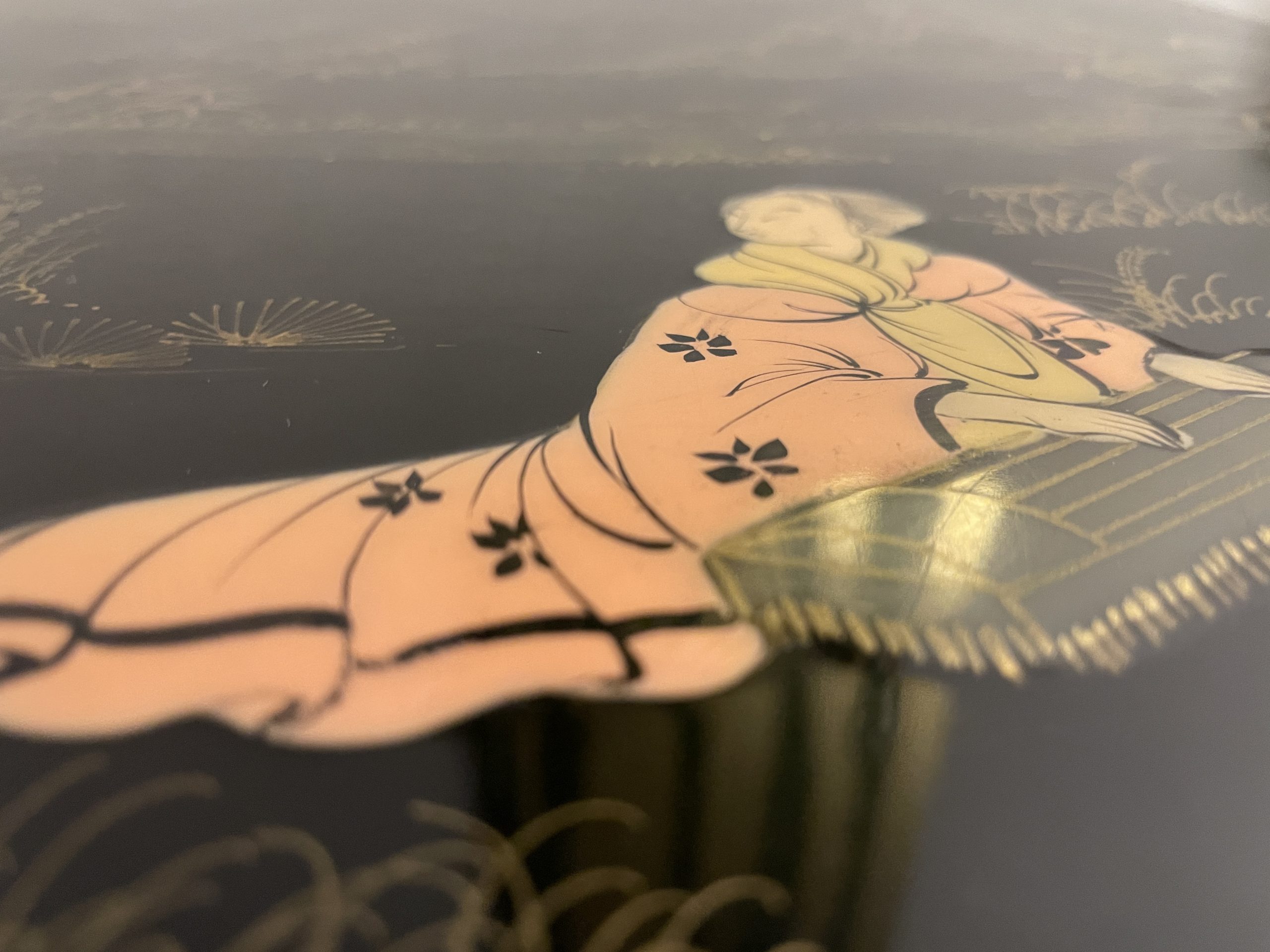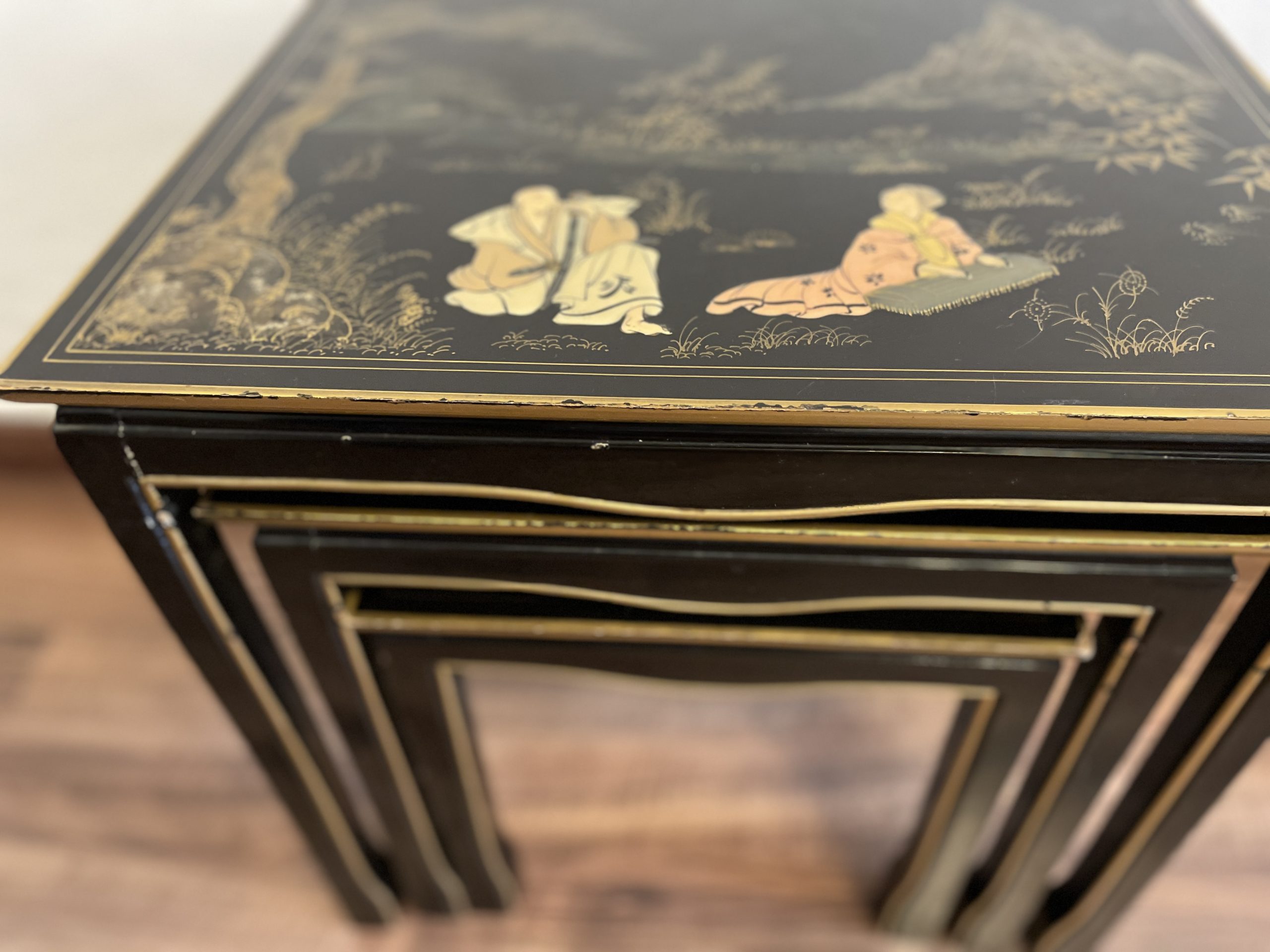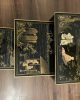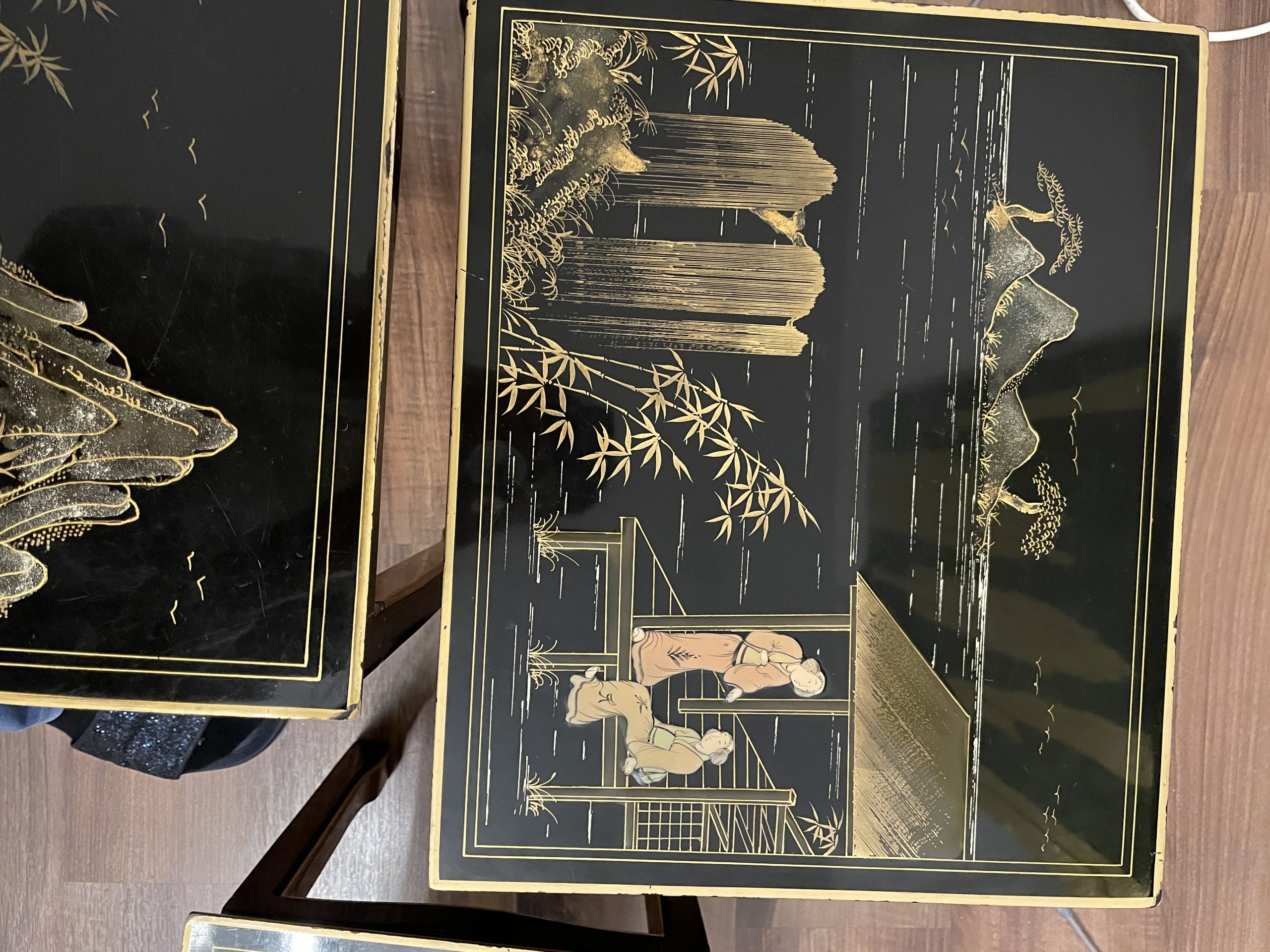 Precioso Conjunto / nido de mesitas estilo oriental. Dibujos volumétricos relieves. Lacado. De los anos 50 s. Desgastos menores según su edad. Tiene tres mesitas
