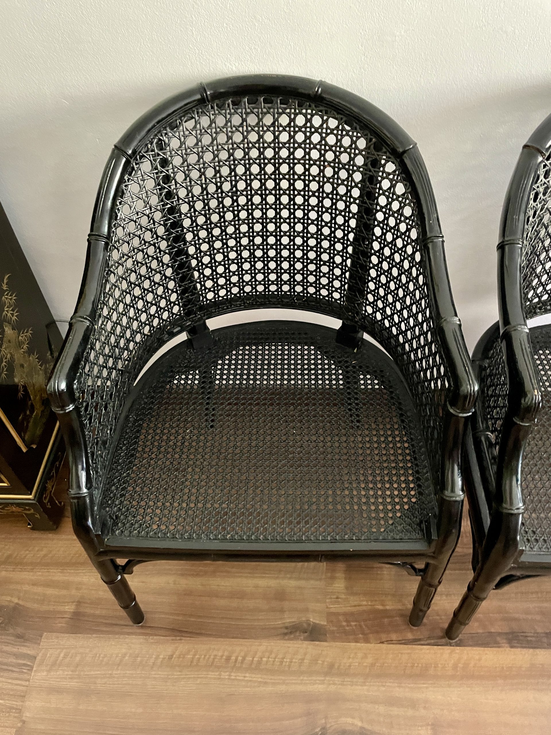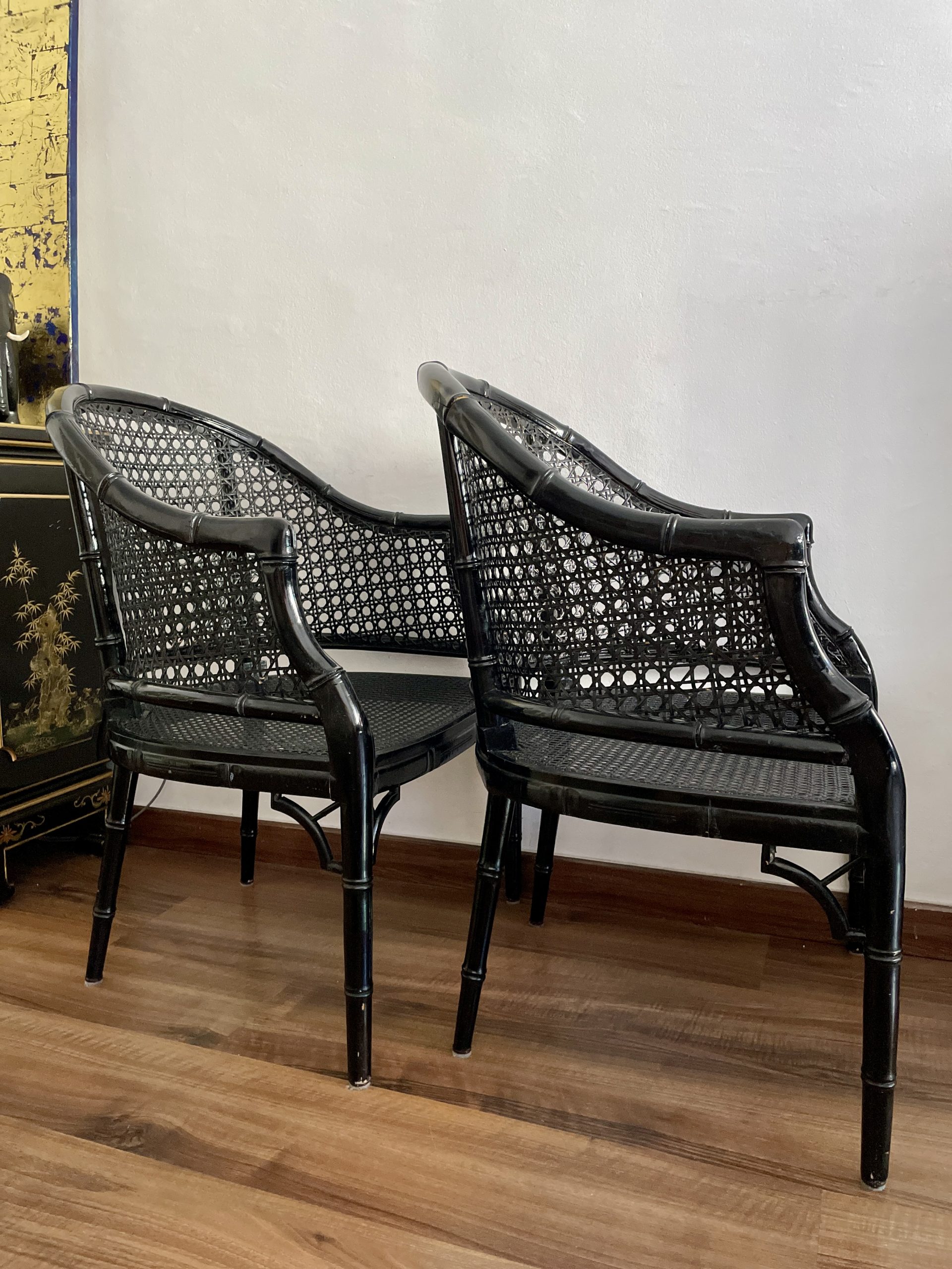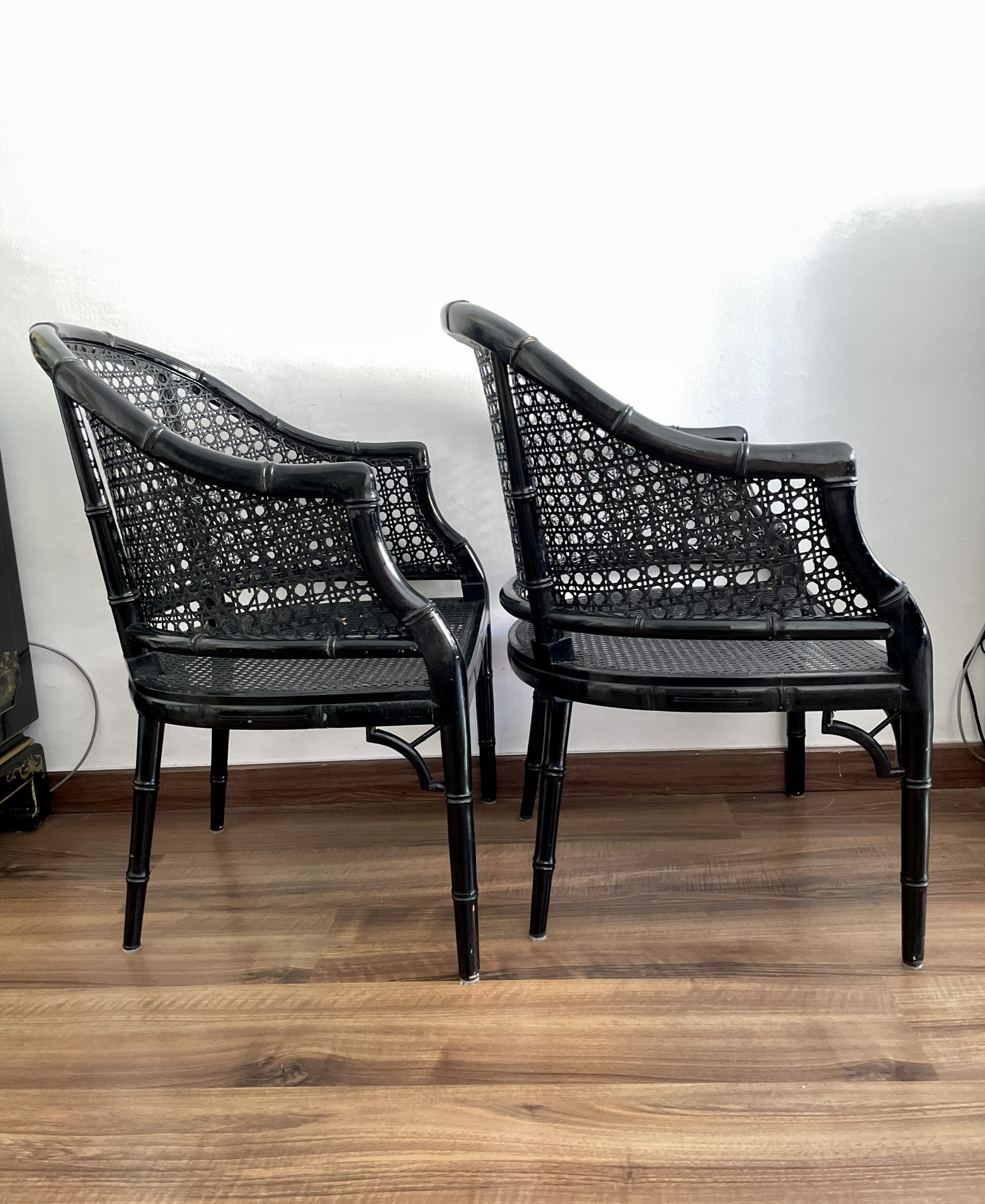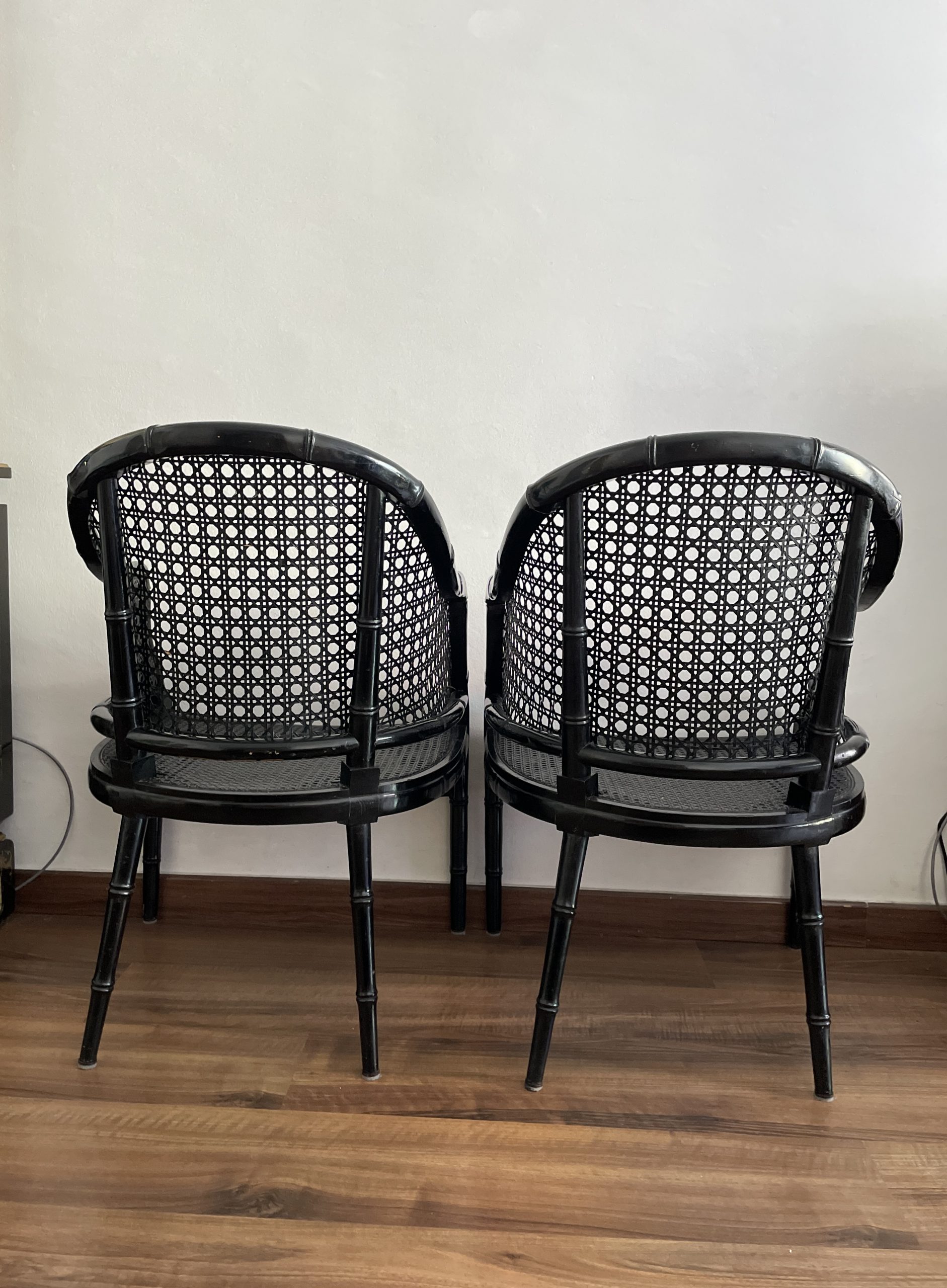 Sillas   vintage lacquered  en negro   de bambú falso  de estilo Hollywood Regency .